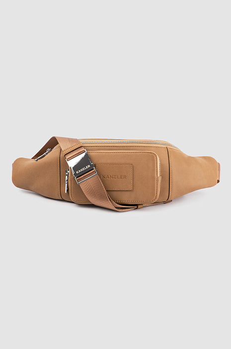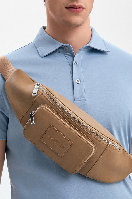 Бежевая поясная сумка KANZLER из гладкой матовой кожи с тисненым логотипом — верный помощник, если Вы живете в городе. Во-первых, в нее можно сложить телефон, наушники, карточки и другие необходимые мелочи, во-вторых, она очень удобна и может носиться, как минимум, тремя способами — кросс-боди, на поясе и на плече, сзади. Стильная модель вариативна в сочетаниях с одеждой — ее можно надевать и с костюмом и плащом, и с одеждой в уличном и спортивном стилях. Предусмотрено вместительное основное отделение и карман для мелочей. Широкий текстильный ремень можно регулировать.