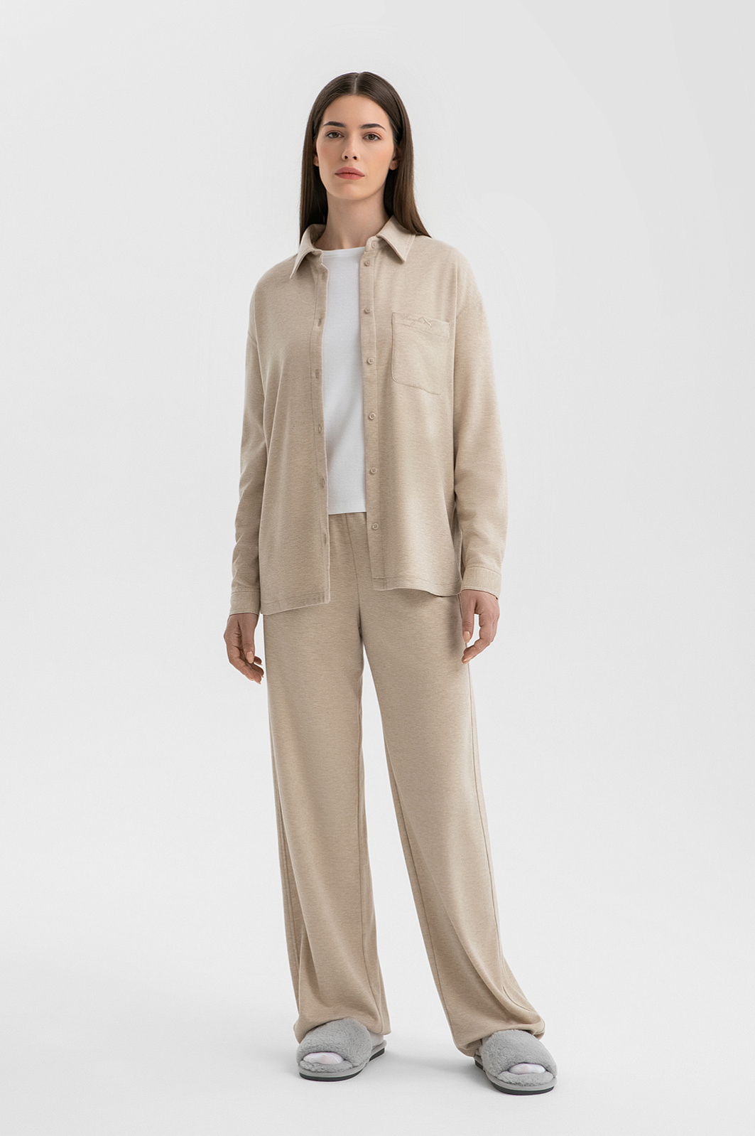 Пижамные брюки KANZLER – не просто одежда для сна и отдыха, а воплощение концепции неспешной жизни, где каждый момент наполнен безмятежностью. Свободный силуэт сохраняет женственность линий, а отстроченные лампасы визуально вытягивают фигуру. Мягкая резинка на талии обеспечивает комфортную посадку. Состав – идеально сбалансированный микс волокон: полиэстер обеспечивает прочность и устойчивость к деформации, вискоза дарит шелковистую гладкость и терморегуляцию, полиамид добавляет эластичности, акрил фиксирует форму, предотвращая усадку, а шерсть служит добавкой для сохранения тепла, не перегревая тело. Рекомендуем дополнить модель свободной рубашкой из нашей коллекции.