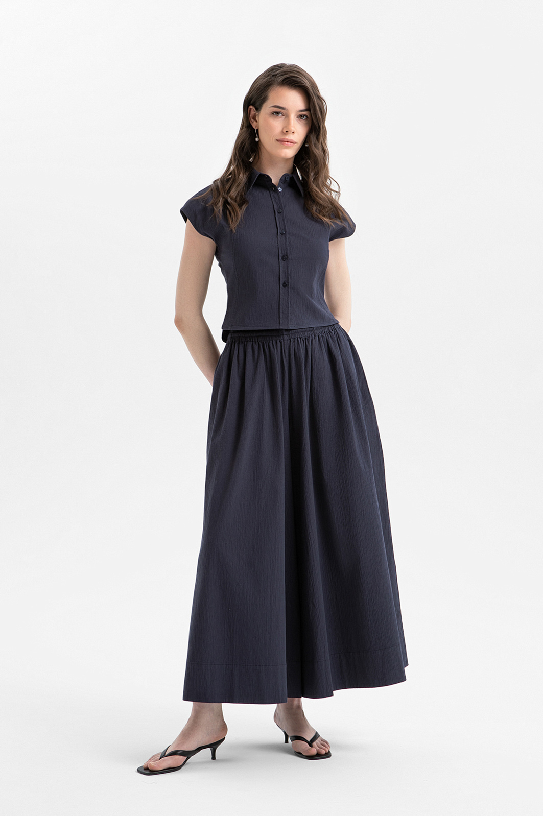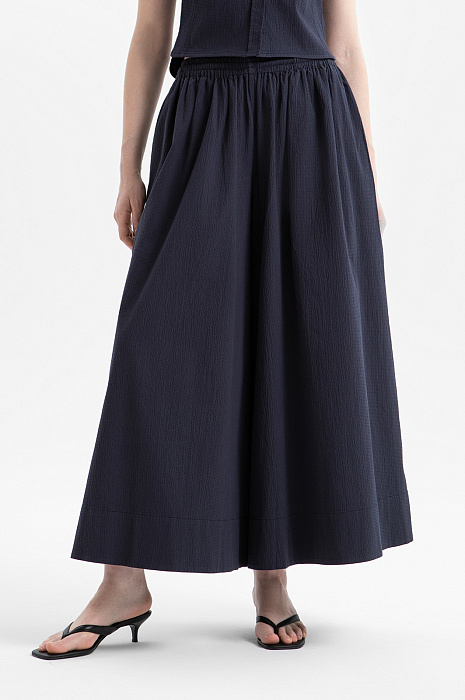 Свободные кюлоты KANZLER с эластичным поясом из хлопка сочетают в себе комфорт широких брюк и эстетику длинной романтичной юбки. Кюлоты длиной до щиколотки визуально вытягивают фигуру и создают мягкий, женственный силуэт. Эластичный пояс образует густую сборку и акцентирует внимание на линии талии. Широкий крой не сковывает движения и обеспечивает ощущение лёгкости в повседневной носке. Мелкоячеистая текстура добавляет ткани визуальную глубину. Материал произведён из натурального хлопка. Его гипоаллергенные волокна хорошо пропускают воздух, поддерживая оптимальную для тела температуру. Небольшая добавка спандекса обеспечивает эластичность ткани, делая посадку более комфортной.