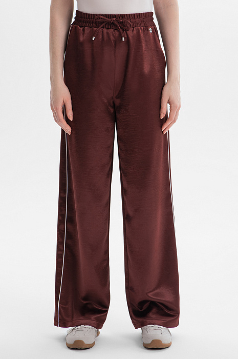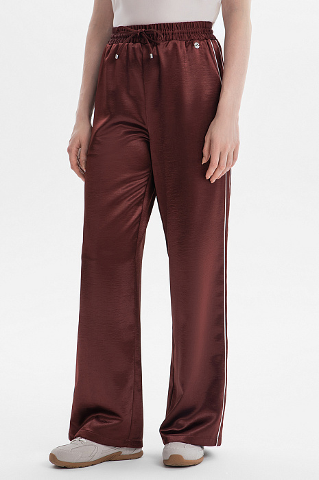 Атласные спортивные брюки KANZLER шоколадного оттенка с лампасами — стильная универсальная вещь, которую удобно носить в повседневной жизни — ходить в модные кофейни, посещать фестивали, гулять по городу и просто быть на улице. Спортивный свободный крой не сковывает движений. Кулиска на поясе позволяет регулировать объем талии. Гладкий струящийся материал драпируется на теле красивыми мягкими складками. Легкие прочные волокна полиэстера не деформируются со временем и отличаются износоустойчивостью. Параметры модели: рост 175, 88-65-92 Размер на модели: S
