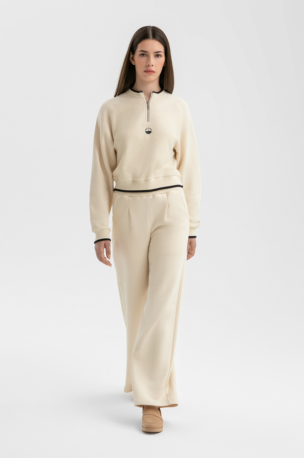 Удобные стильные брюки KANZLER кремового цвета из чистого хлопка с расслабленном силуэтом обеспечивает комфорт и свободу движений. Это нарядный и эффектный вариант для уикенда, прогулки, похода в спортивный клуб или спа. Пояс с широкой трикотажной резинкой дополнен кулиской с шнурком, которая позволяет регулировать посадку. Плавный клёш от бедра и мягкие защипы спереди формируют женственный силуэт, визуально удлиняя ноги и придавая образу непринуждённость. Материал брюк — мягкий приятный к телу натуральный трикотаж из дышащего гипоаллергенного хлопка (100%), который поддерживает комфорт тела весь день.