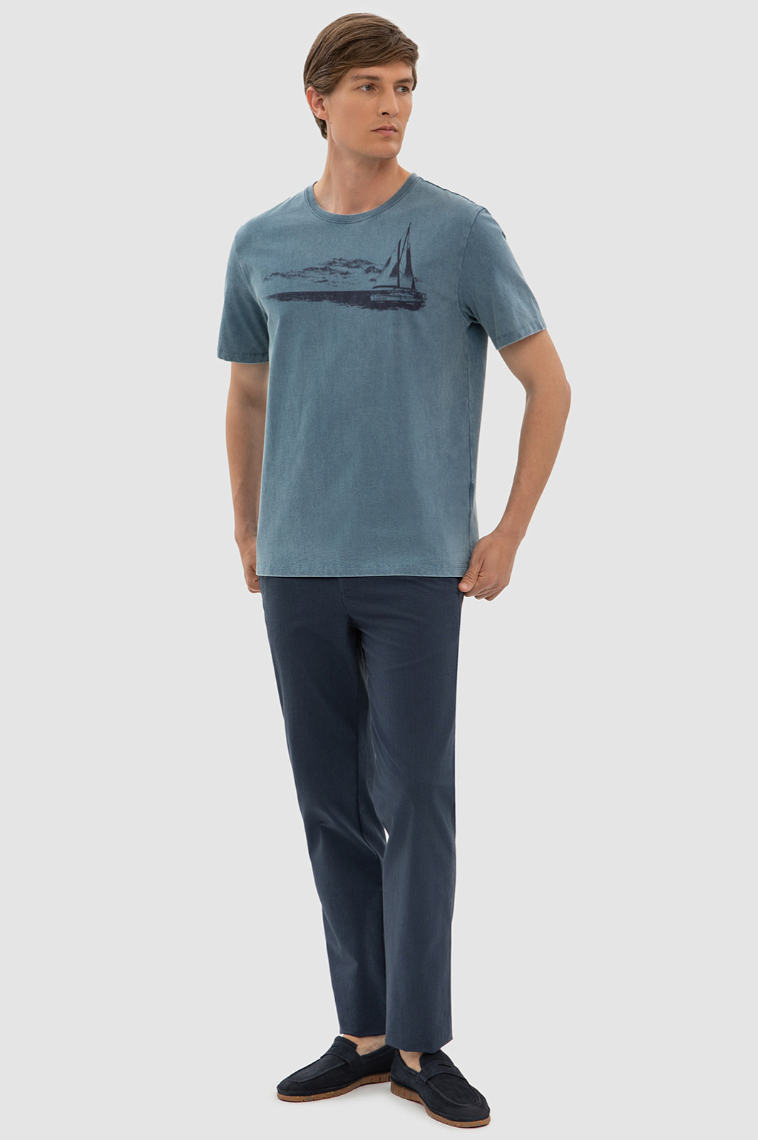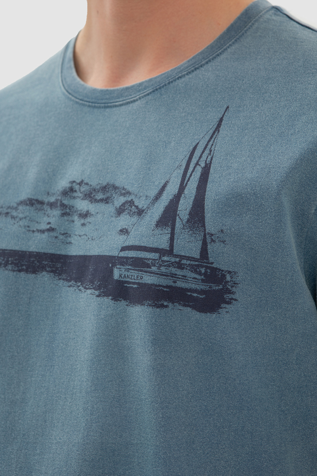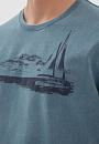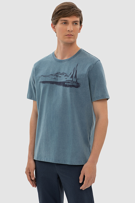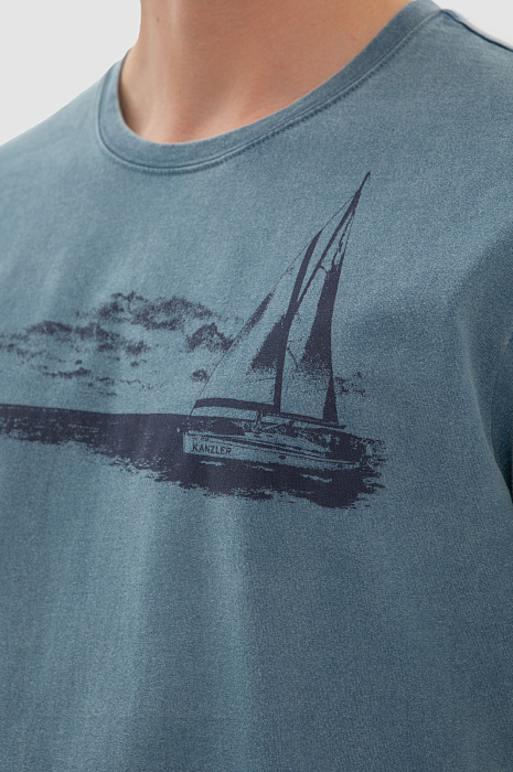 Темно-голубая хлопковая футболка KANZLER украшена морским принтом. Корабль с парусами зовет в неизведанные дали — подальше от будничной суеты, поближе к красоте и природе. Свободный крой футболки подойдет для любого типа фигуры. Сдержанный серо-голубой оттенок сочетается с синими, черными и светлыми джинсам и шортами. Мягкий дышащий материал из чистого хлопка сохраняет тело сухим при активных физических нагрузках и высокой температуре. Ткань не выцветает на солнце, надолго сохраняя первоначальный вид.