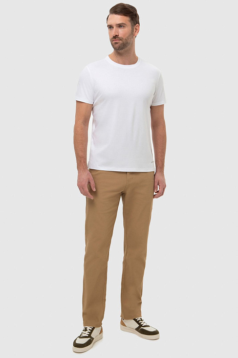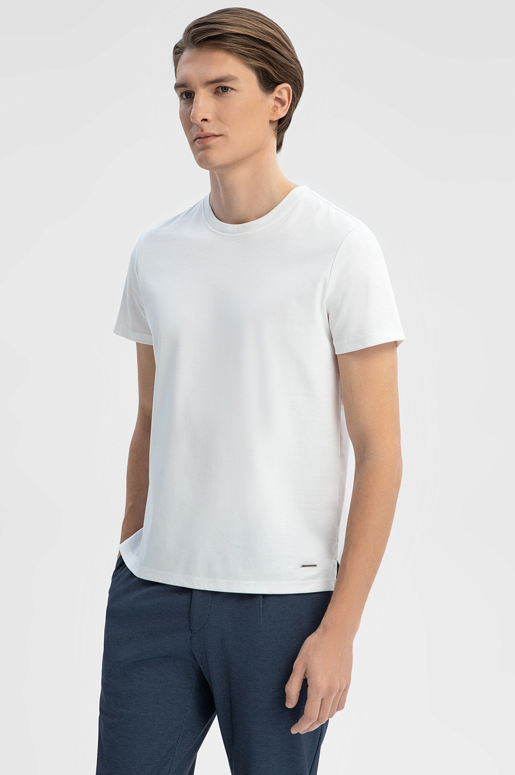 Белая футболка KANZLER приталенного кроя сшита из гладкого хлопкового джерси, отлично пропускающего воздух. Модель с круглым вырезом украшена металлическим брендированным патчем и небольшими разрезами по бокам, которые добавляют стильные акценты и обеспечивают дополнительную свободу движений. Эта базовая футболка станет ключевым элементом вашего гардероба, легко сочетаясь с любой одеждой. Ее можно носить как самостоятельно, так и в качестве базового слоя под рубашку, джемпер или бомбер. Для более стильного образа наши стилисты предлагают сыграть на контрасте цветов и сочетать изделие с песочными брюками и кедами в тон. Изготовленная из высококачественного нежного хлопка, она обеспечивает исключительный комфорт и мягкость при носке. Параметры модели: рост 191, 97-77-99 Размер на модели: M