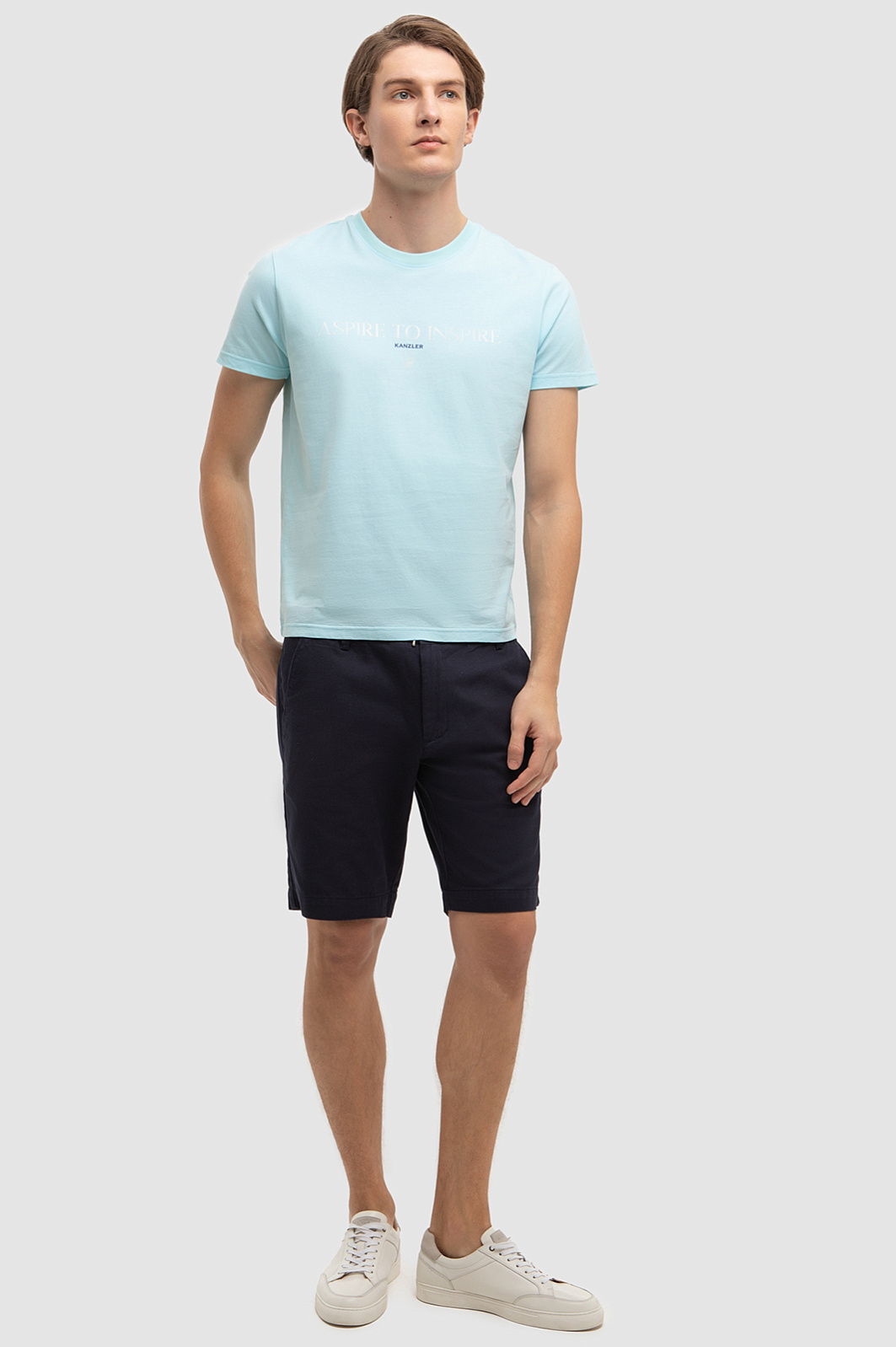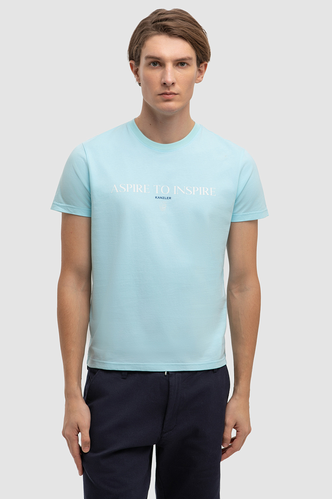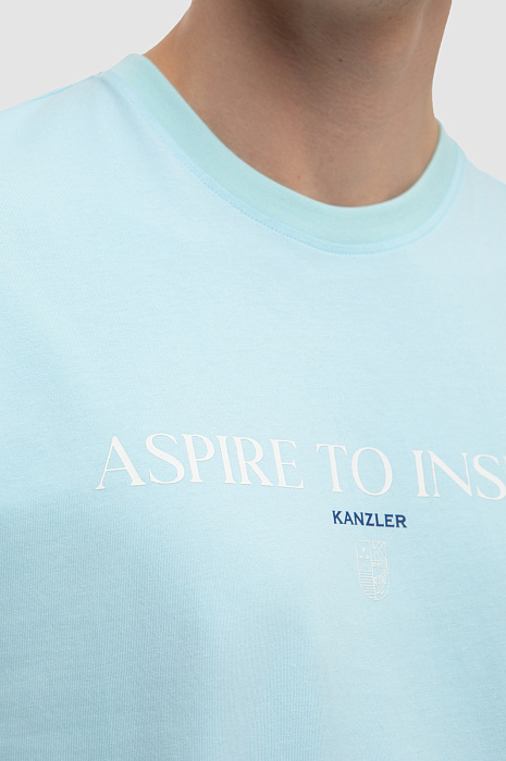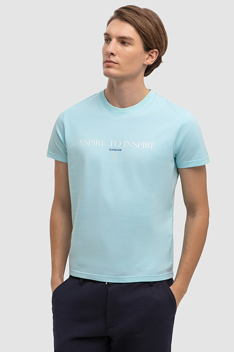 Футболка KANZLER красивого светло-бирюзового оттенка из чистого хлопка украшена слоганом «Aspire to inspire» (стремись вдохновлять) и небольшим фирменным логотипом. Она идеально подойдет для активного отдыха — прогулок по городу, уик-энда на природе и пляжных вечеринок. Прилегающий крой подчеркивает достоинства спортивной фигуры и не сковывает движений. 100-процентный хлопок высокого качества бережет тело от солнца и прохлады. Гипоаллергенные дышащие волокна создают циркуляцию воздуха, оптимальный микроклимат и отводят влагу.