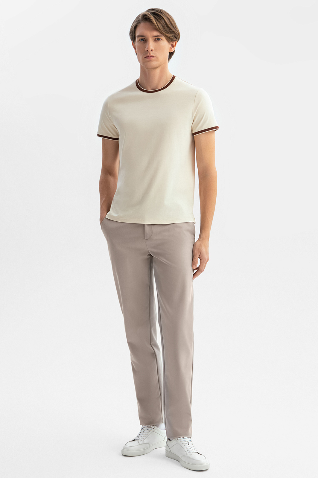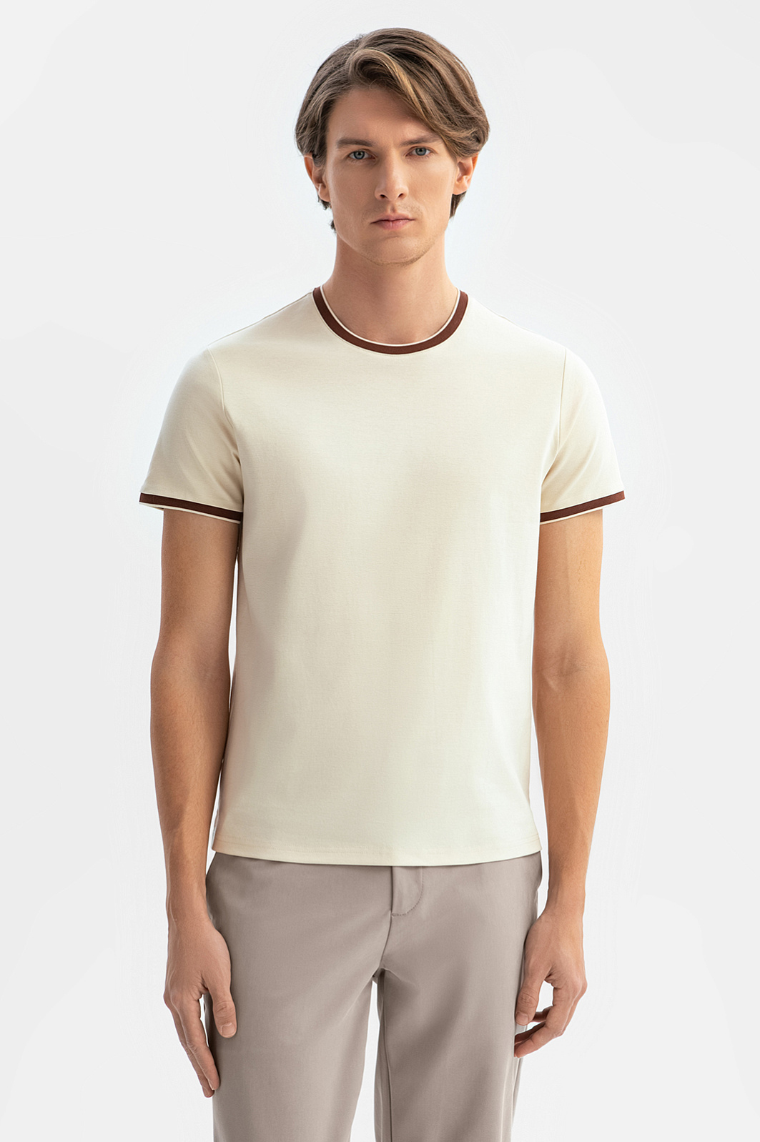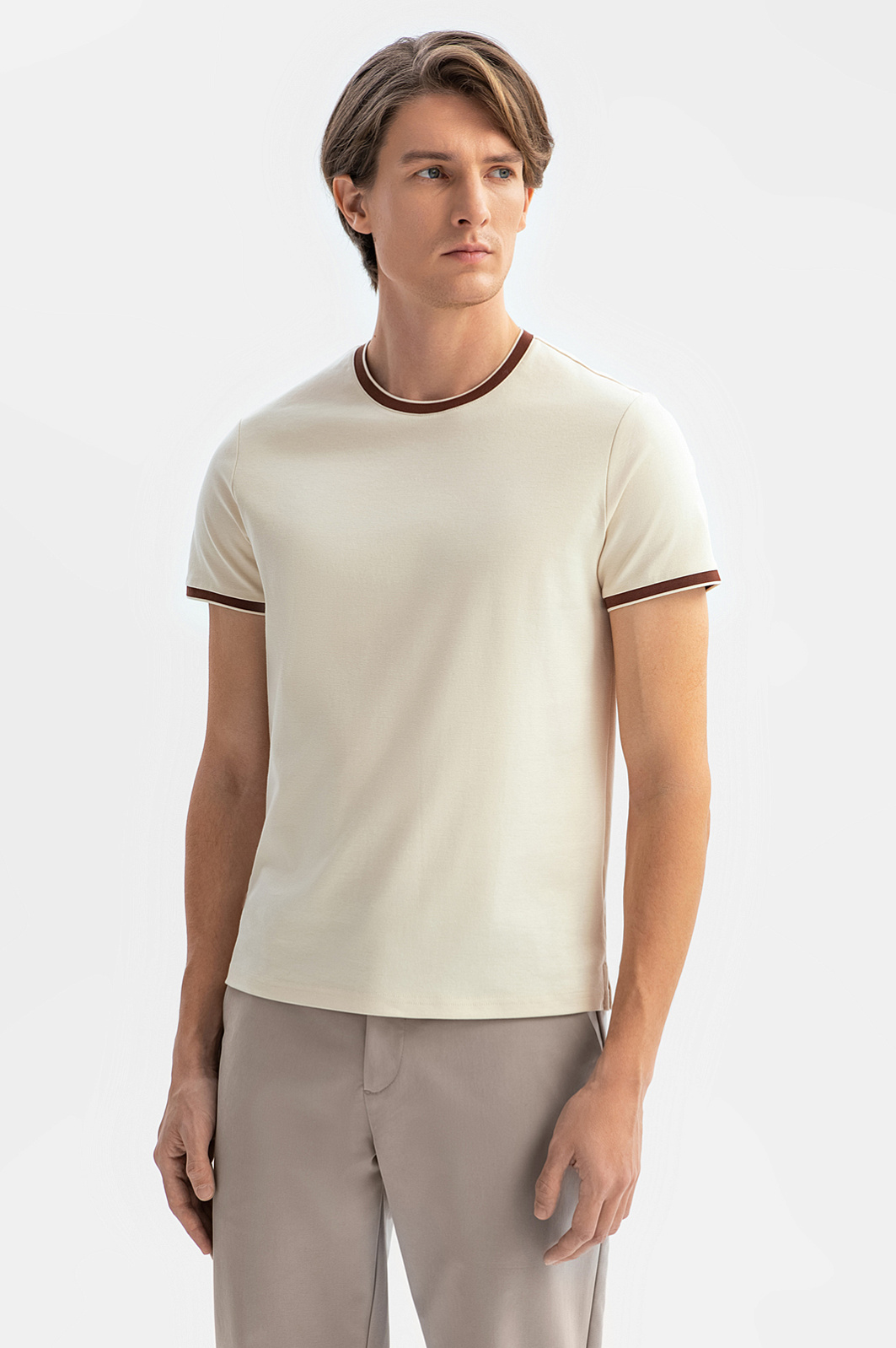 Бежевая футболка KANZLER — это идеальный баланс минимализма и изысканного дизайна. Материал — 100% хлопок, обладающий высокой воздухопроницаемостью и мягкостью, обеспечивает комфорт в любую погоду, а прочная структура ткани сохраняет форму даже после многократных стирок. Приталенный крой подчёркивает достоинства фигуры. Коричневая окантовка на вороте и рукавах добавляет изысканный акцент и выделяет модель из ряда базовых вещей. Сочетайте футболку с брюками или джинсами для завершения стильного образа. Параметры модели: рост 191, 97-77-99 Размер на модели: M