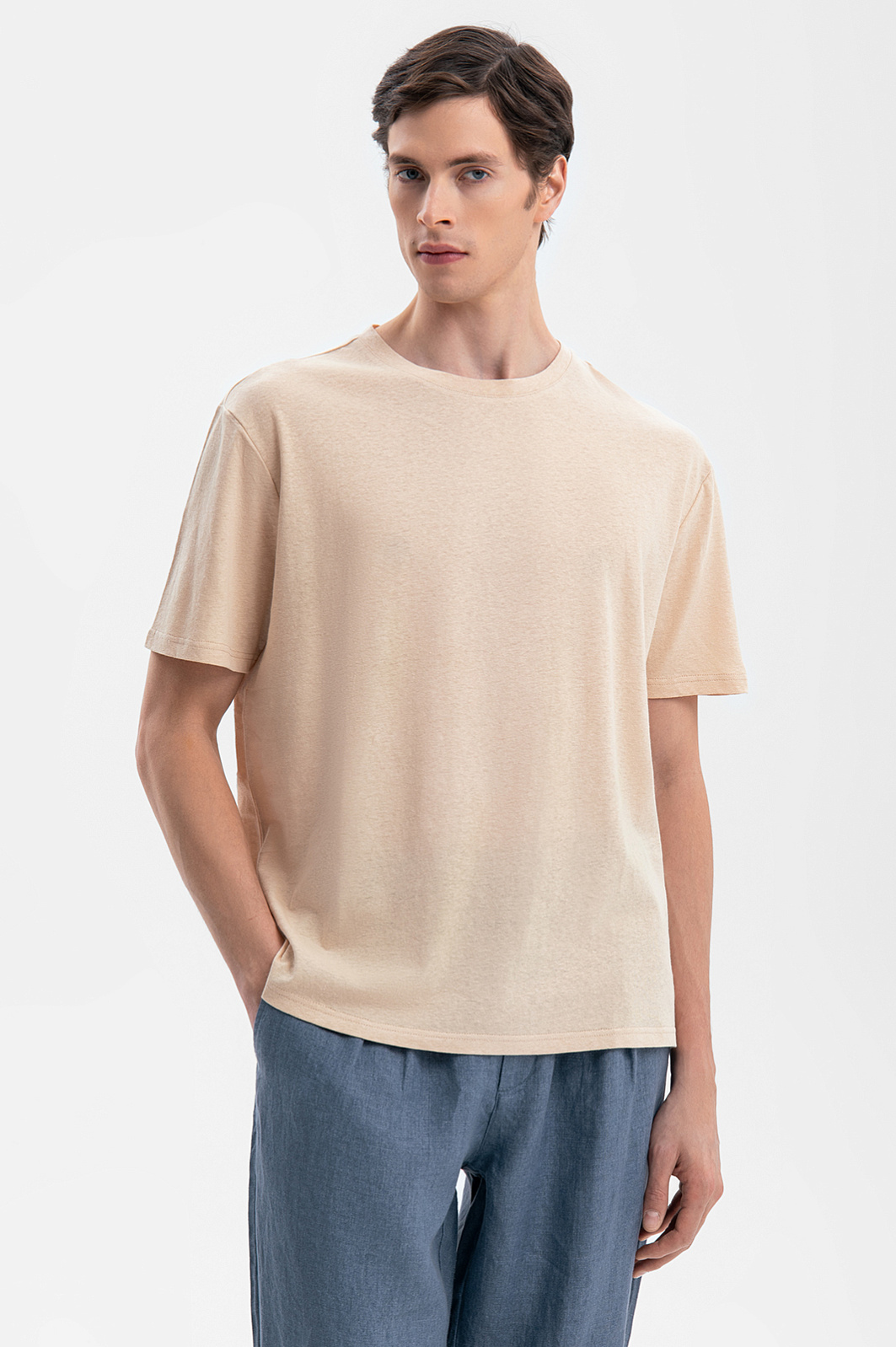 Футболка – ключевой элемент весенне-летнего гардероба. В новой коллекции дизайнеры KANZLER уделили особое внимание моделям, в которых для комфорта в теплое время года предусмотрено все. Бежевая футболка выполнена из натурального льна (55%) и хлопка (45%). Легкий смесовый материал отлично впитывает влагу, быстро сохнет и обеспечивает терморегуляцию, охлаждая кожу в жаркий день. Даже после многократных стирок футболка сохраняет форму и благородную матовую фактуру, характерную для премиального льна. Свободный крой не стесняет движений и подходит любому типу фигуры. Бежевый оттенок, благородный и универсальный, легко интегрируется в любой гардероб. Сочетайте футболку с льняными брюками и эспадрильями для городской прогулки, комбинируйте с рубашкой оверсайз и кроссовками в стиле городской кежуал или брюками и лоферами – для вечернего выхода. Параметры модели: рост 189, 91-78-95 Размер на модели: М