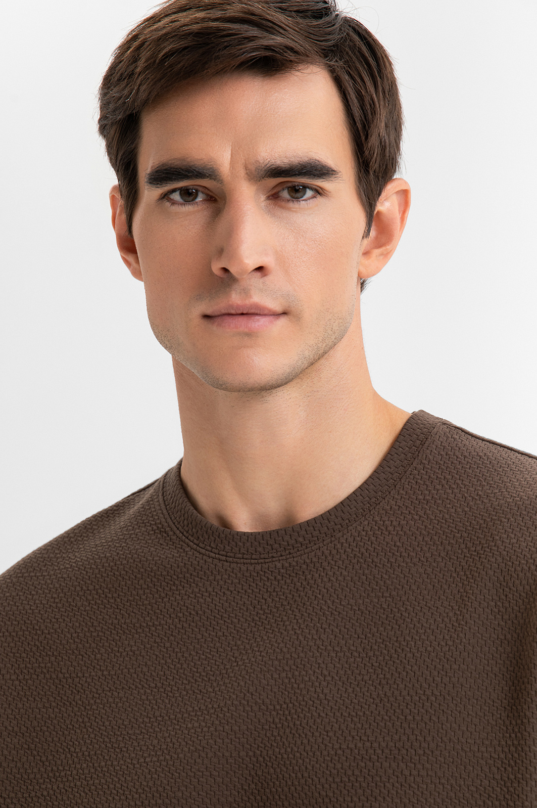 Футболка KANZLER с круглым вырезом выполнена из хлопкового трикотажа. Приятный шоколадный оттенок и деликатная вязаная фактура придают образу мягкость, благородство и уют. Эта футболка легко вписывается в расслабленные городские и спортивные образы, сочетаясь с джоггерами, джинсами и неформальными брюками. Свободный крой обеспечивает комфорт и не сковывает движений. Мягкий и эластичный трикотаж на основе воздухопроницаемого гипоаллергенного хлопка приятен к телу, хорошо дышит и сохраняет форму даже после многократных стирок. Параметры модели: рост 192, 101-76-97 Размер на модели: M
