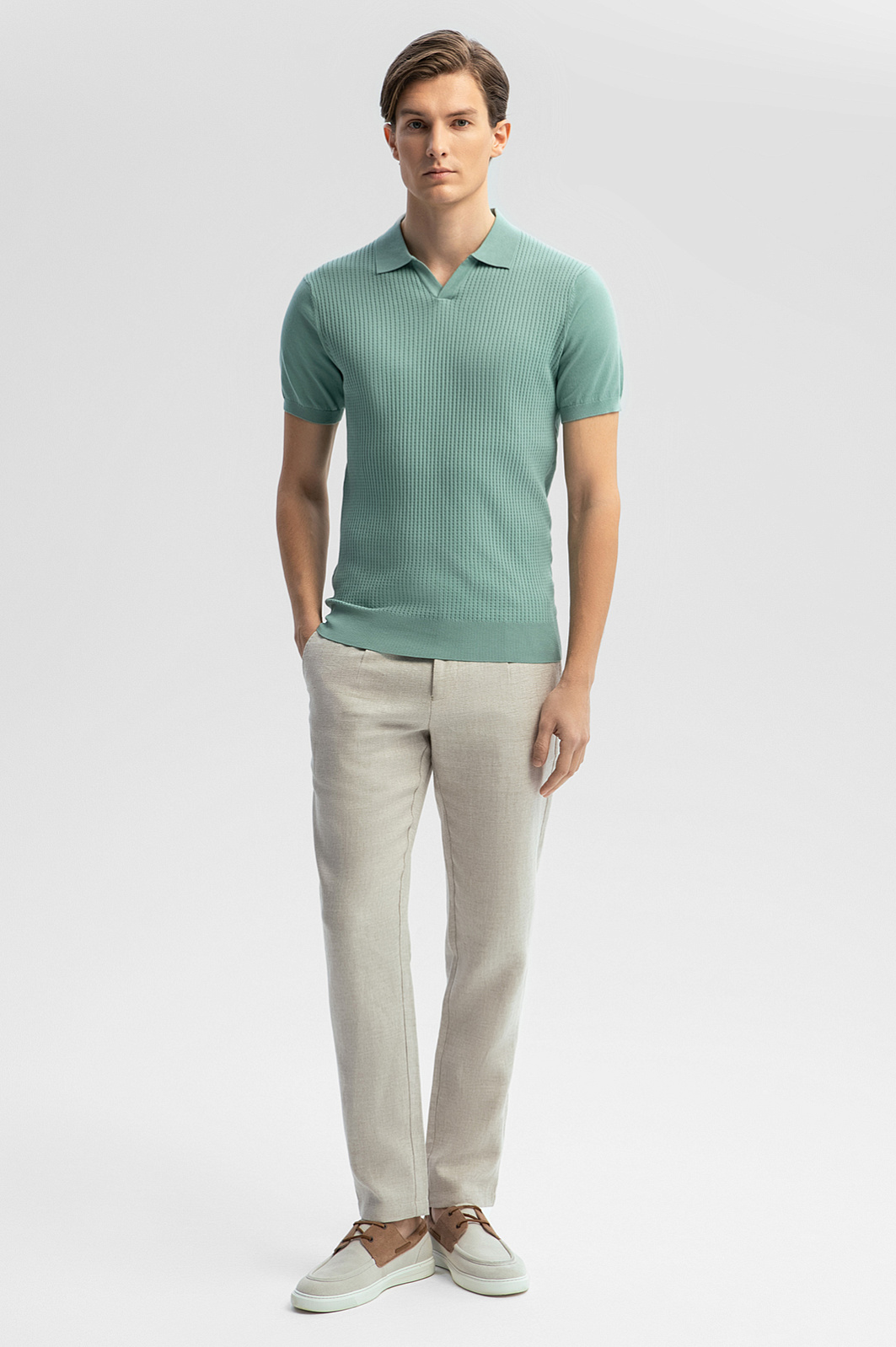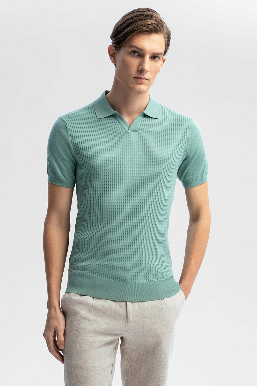 Поло KANZLER освежающего мятного оттенка из дорогого хлопка Пима станет отправной точкой для создания легких изысканных образов с джинсами, хлопковыми брюками или шортами. Очарование модели с неглубоким треугольным вырезом придает фактурная передняя часть. Спинка выполнена из гладкого трикотажа. Мягкие резинки на рукавах и снизу обеспечивают аккуратную посадку. Дорогой материал из чистого хлопка — это суперкомфорт, помноженный на практичность. Собранные вручную длинные шелковистые волокна хлопка сорта Пима превращаются в легчайшую ткань, которая значительно превосходит обычные хлопчатобумажные материалы по износоустойчивости и прочности. Среди других достоинств — не уступающая кашемиру мягкость и отличные дышащие свойства, благодаря которым в футболке легко переносится даже 30-градусная жара. Параметры модели: рост 191, 97-77-99 Размер на модели: M