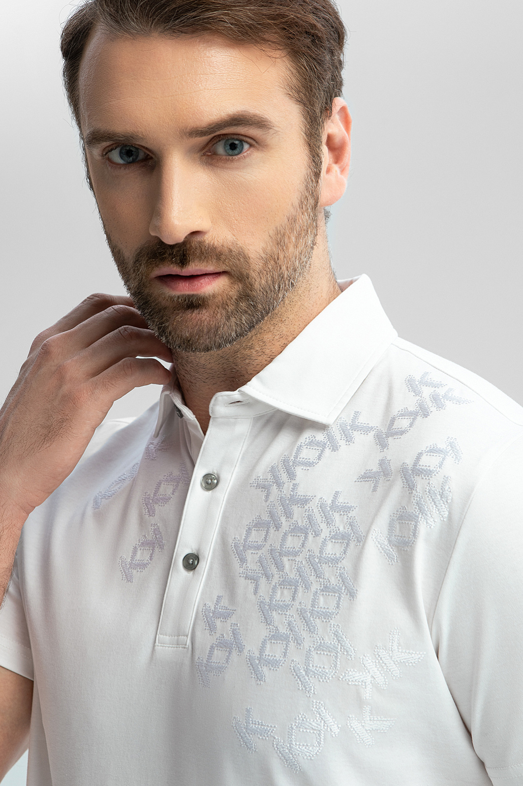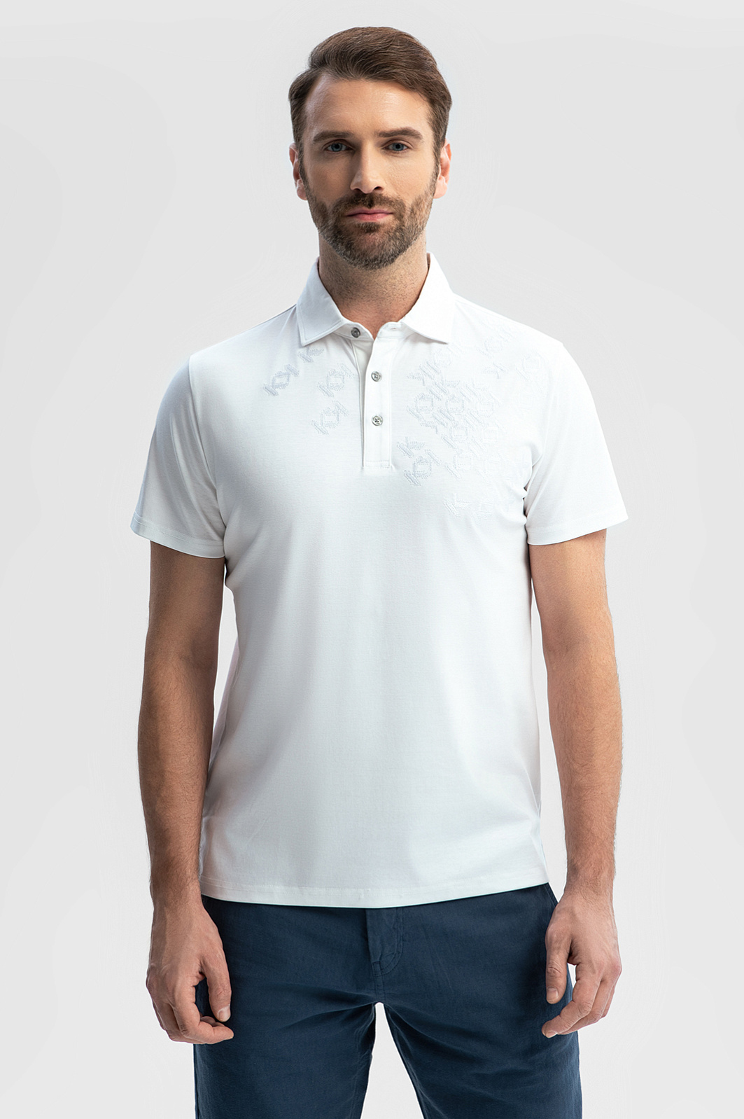 Белоснежное поло KANZLER с вышивкой выполнили из уникального материала премиального качества – 100% мерсеризованного хлопка. Процесс мерсеризации придает натуральным волокнам повышенную устойчивость к выцветанию, деформации и образованию катышков. Ткань с шелковистой фактурой обеспечивает воздухообмен и дарит коже комфорт и ощущение свежести в течение всего дня. На груди – орнамент из логотипов, выполненный нитью в тон ткани. Рельефная вышивка – привлекающий внимание деликатный акцент, создающий игру света и тени. Приталенный крой аккуратно подчеркивает достоинства мужской фигуры, сохраняя свободу движений. Белый цвет – универсальный фон для любого образа – повседневного, офисного или расслабленного уличного.