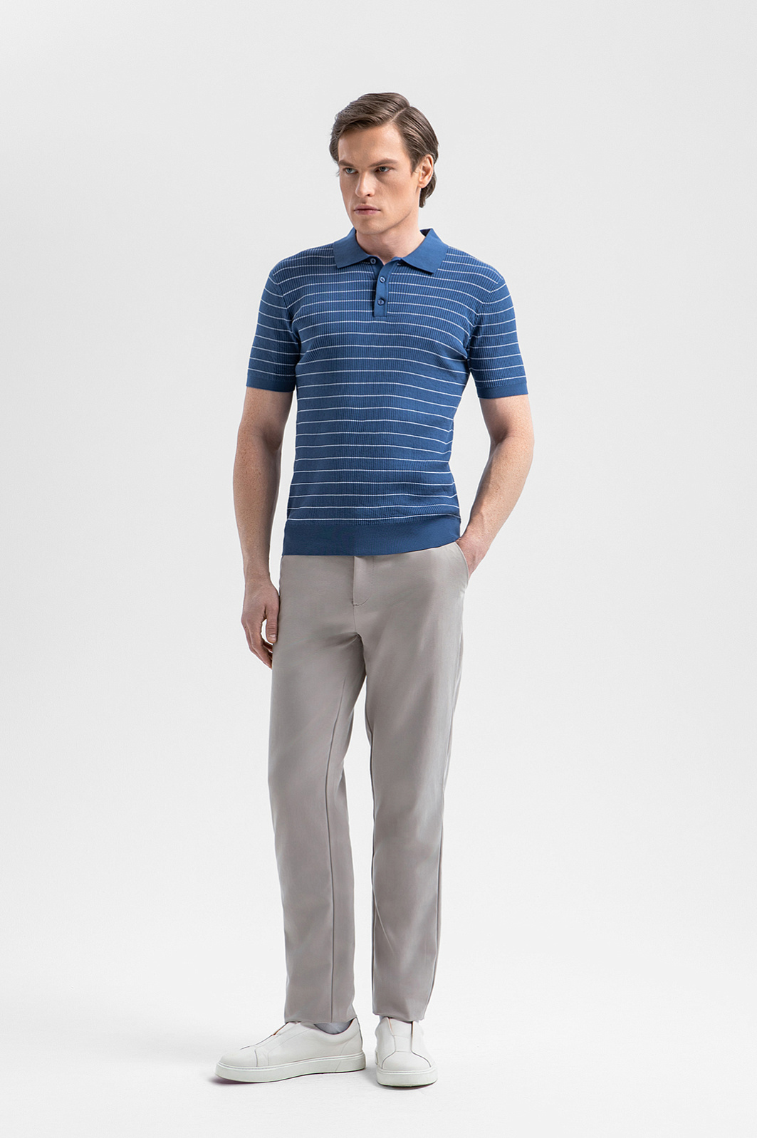 Роскошное поло KANZLER с коротким рукавом из премиального хлопка Пима — универсальная модель для отдыха в тёплый сезон. Сочетание синего и белого навевает мысли о морской романтике, вечеринках на яхте и расслабленном курортном отдыхе. Отложной воротник и застёжка на пуговицах подчёркивают классический характер модели. Трикотажные резинки на рукавах и по низу фиксируют края и обеспечивают аккуратную посадку. Модель выполнена из драгоценного хлопка Пима. Длинные тонкие натуральные волокна делают ткань мягкой и шелковистой. Такой материал отлично пропускает воздух, сохраняет форму и поддерживает ощущение свежести.
