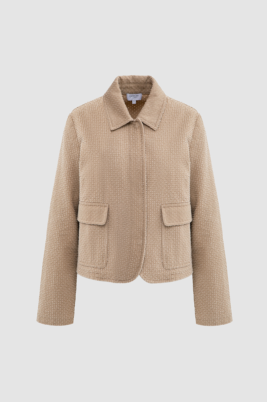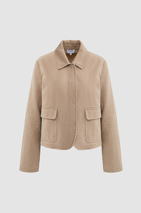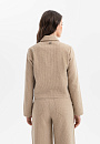 Бежевый брючный костюм KANZLER из чистого хлопка — готовое решение для работы в креативном офисе, выхода в город или встреч без лишних формальностей. Сет составлен из современного укороченного пиджака с застёжкой на кнопки и удобных расклешённых брюк актуального силуэта. Особое внимание привлекает ткань. Белый ворс создаёт выразительный текстурный узор, который добавляет модели шарм и приятную тактильность. В составе — воздухопроницаемый гипоаллергенный хлопок (100%). Саржевое плетение формирует плотную диагональную структуру полотна, благодаря которой материал хорошо держит форму и сохраняет аккуратный внешний вид.