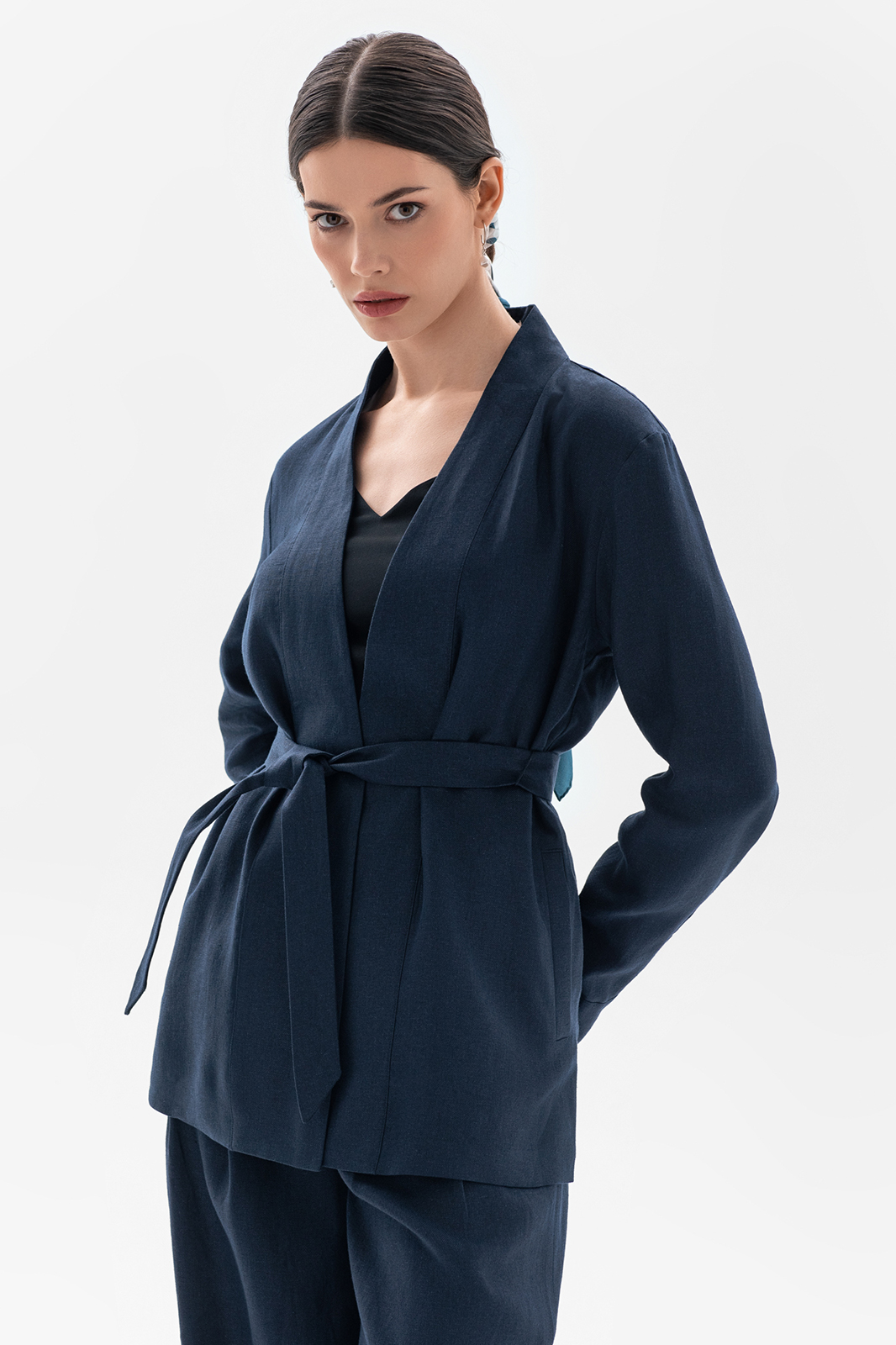 Темно-синий брючный костюм KANZLER изо льна, заданный сдержанными чистыми линиями, выглядит роскошно и расслабленно. Он идеально подойдет для теплых летних дней и межсезонья. Жакет с запахом и небольшими разрезами по бокам можно носить с поясом. Его лаконичный крой напоминает кимоно. Рукава в рубашечном стиле добавляют изысканной простоте спокойную практичность. Брюки A-образного силуэта с высокой талией и мягкими защипами имеют плавные женственные очертания. Дорогая натуральная ткань из 100-процентного льна практически не нагревается в жаркие дни — гипоаллергенные волокна обеспечивают циркуляцию воздуха и отводят влагу, поддерживая свежесть тела.
