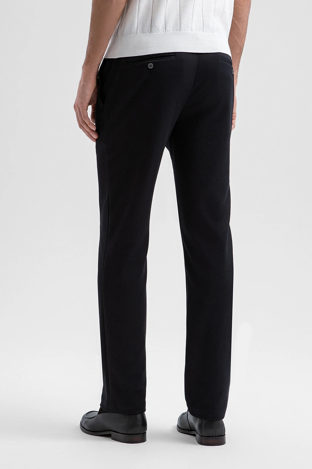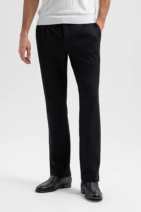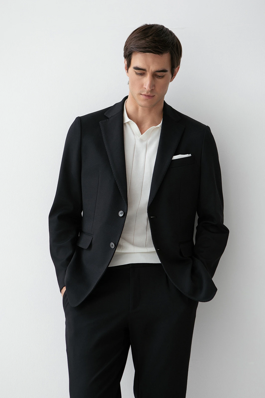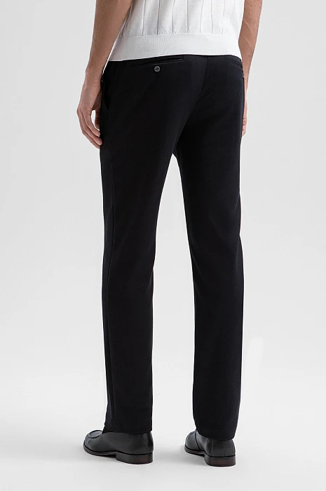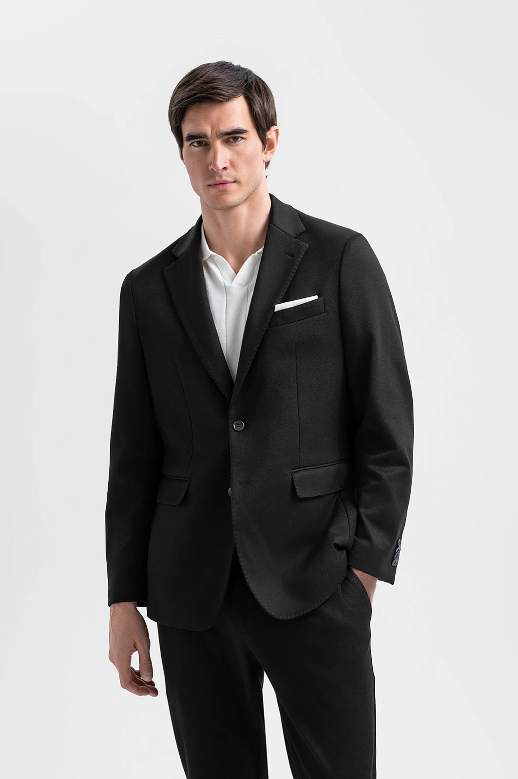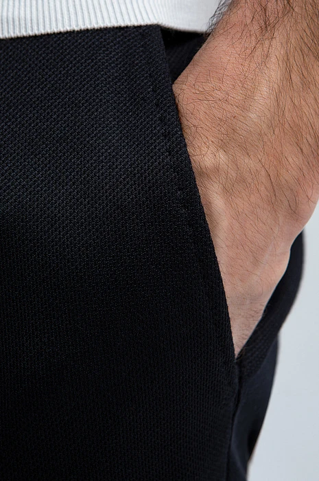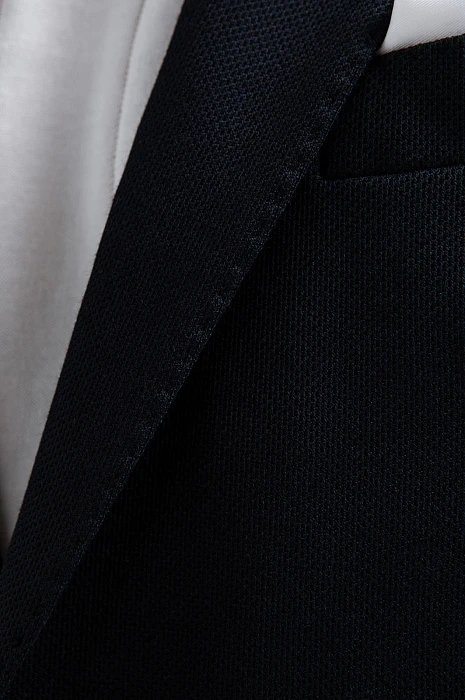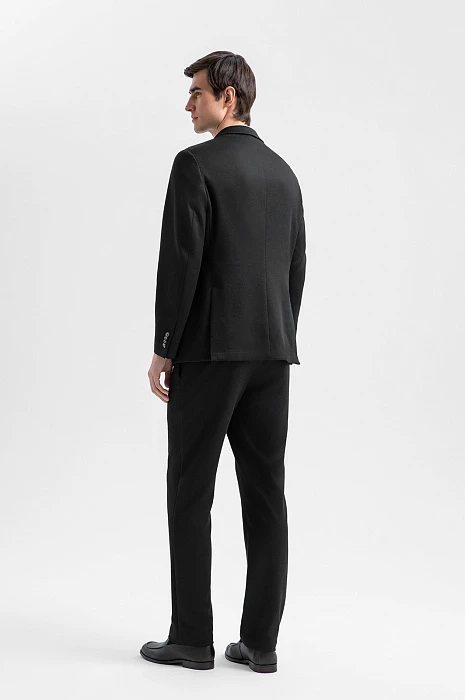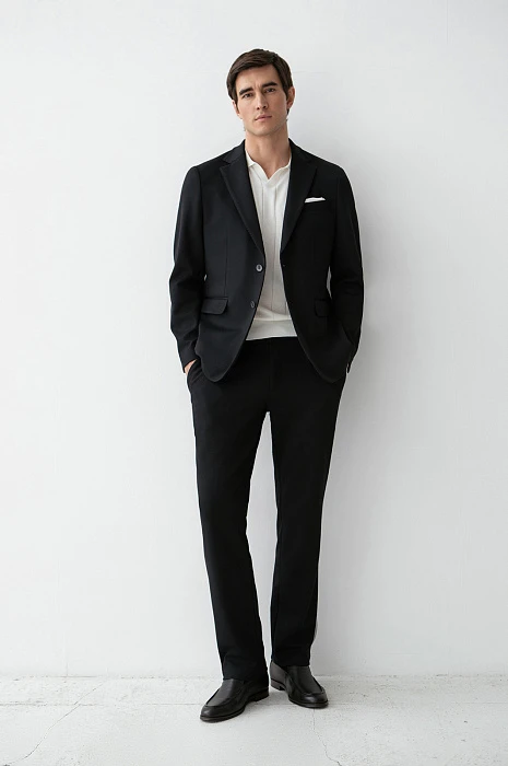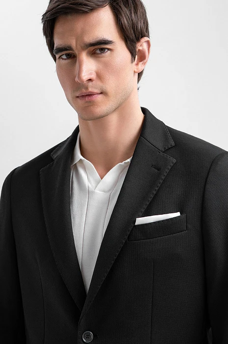 Чёрный костюм KANZLER из выразительной текстурной ткани — деловая классика, переосмысленная в духе современности. Пара составлена из однобортного облегчённого пиджака с традиционными клапанами на нижних карманах и удобных брюк на кулиске с небольшими защипами на поясе. Слегка зауженный крой чётко очерчивает мужественный силуэт. Приятная фактура ткани смягчает строгость чёрного цвета. Универсальный практичный материал на основе полиэстера хорошо держит форму и практически не мнётся. Благодаря добавлению хлопка и района полотно пропускает воздух и сохраняет свежесть в течение дня.