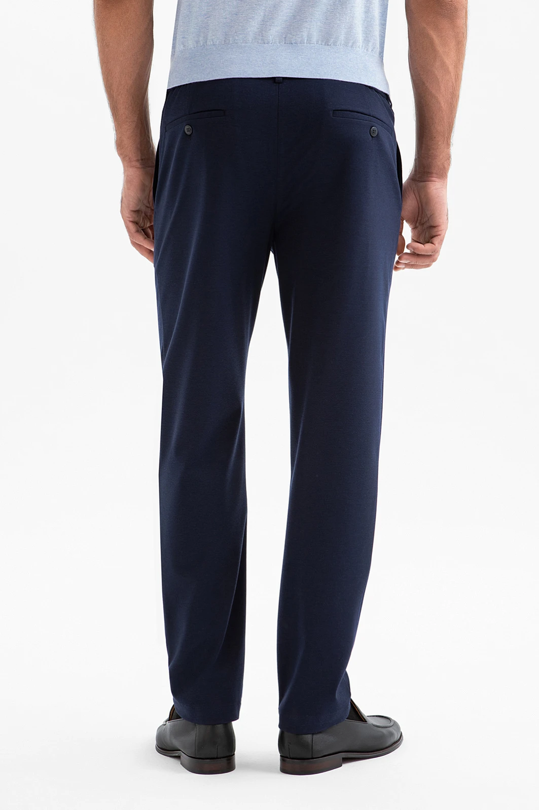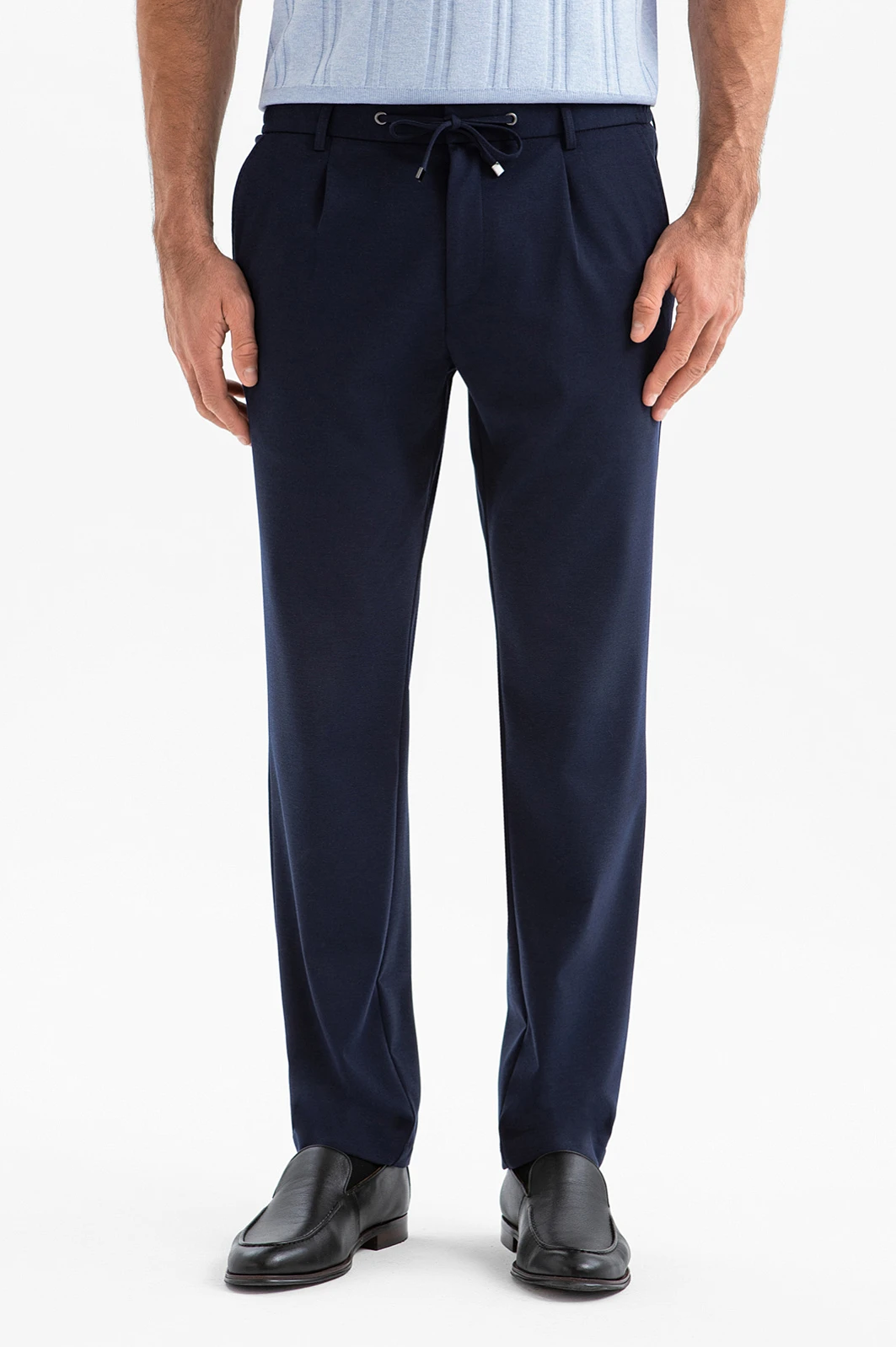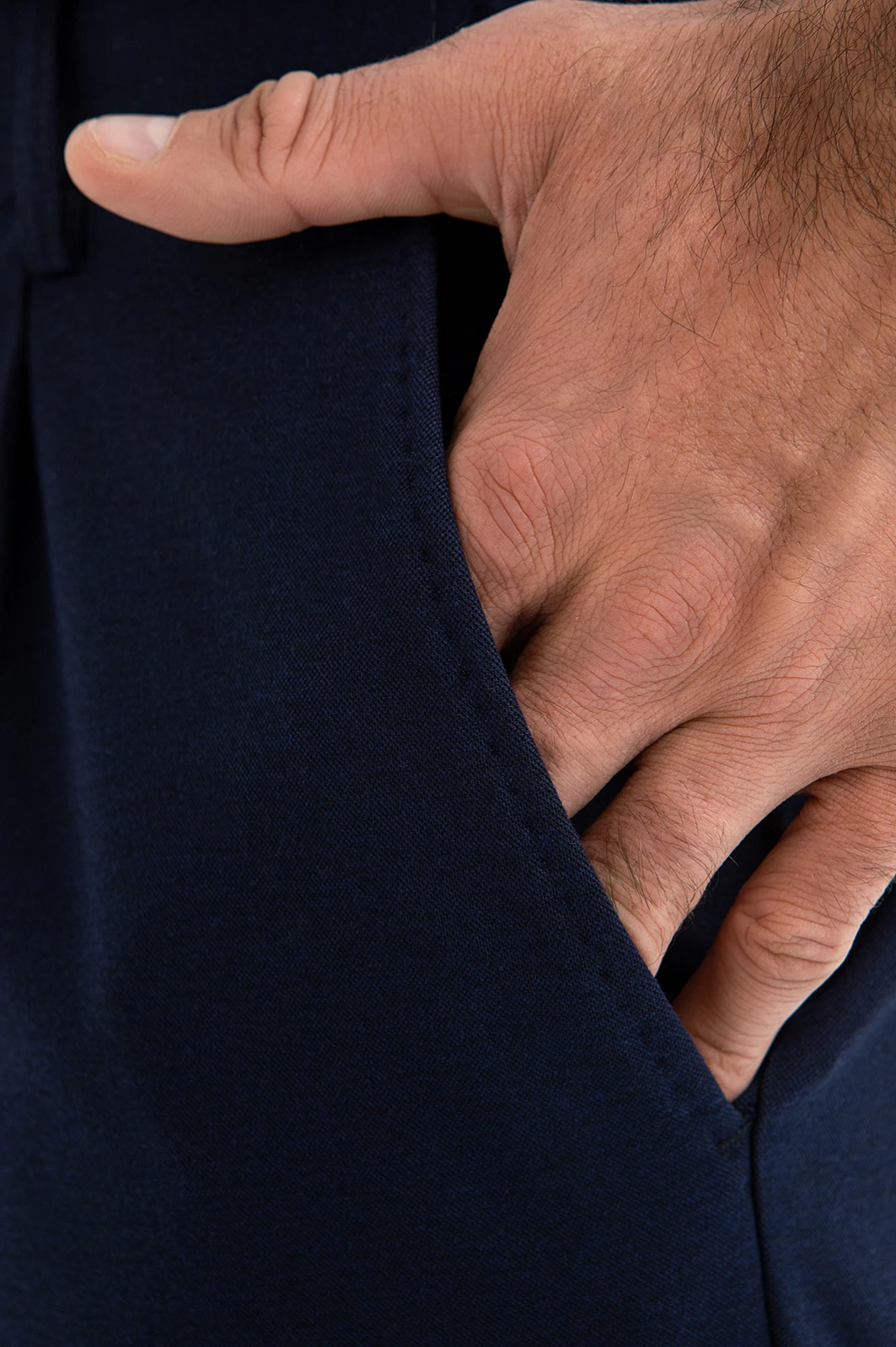 Синий костюм KANZLER зауженного силуэта — воплощение современного делового стиля, союз элегантности и продуманного комфорта. Комплект включает лёгкий однобортный пиджак с прорезными карманами и брюки на кулиске с деликатными защипами на поясе. Элементы пары отличает слегка зауженный крой, который подчёркивает мужественный силуэт и придаёт образу элегантность. Практичная ткань не требует специального ухода. В составе — прочные полиэстер и нейлон с добавлением дышащей вискозы и эластичного спандекса. Технологичный смесовый материал хорошо держит форму и легко адаптируется к индивидуальным особенностям фигуры.