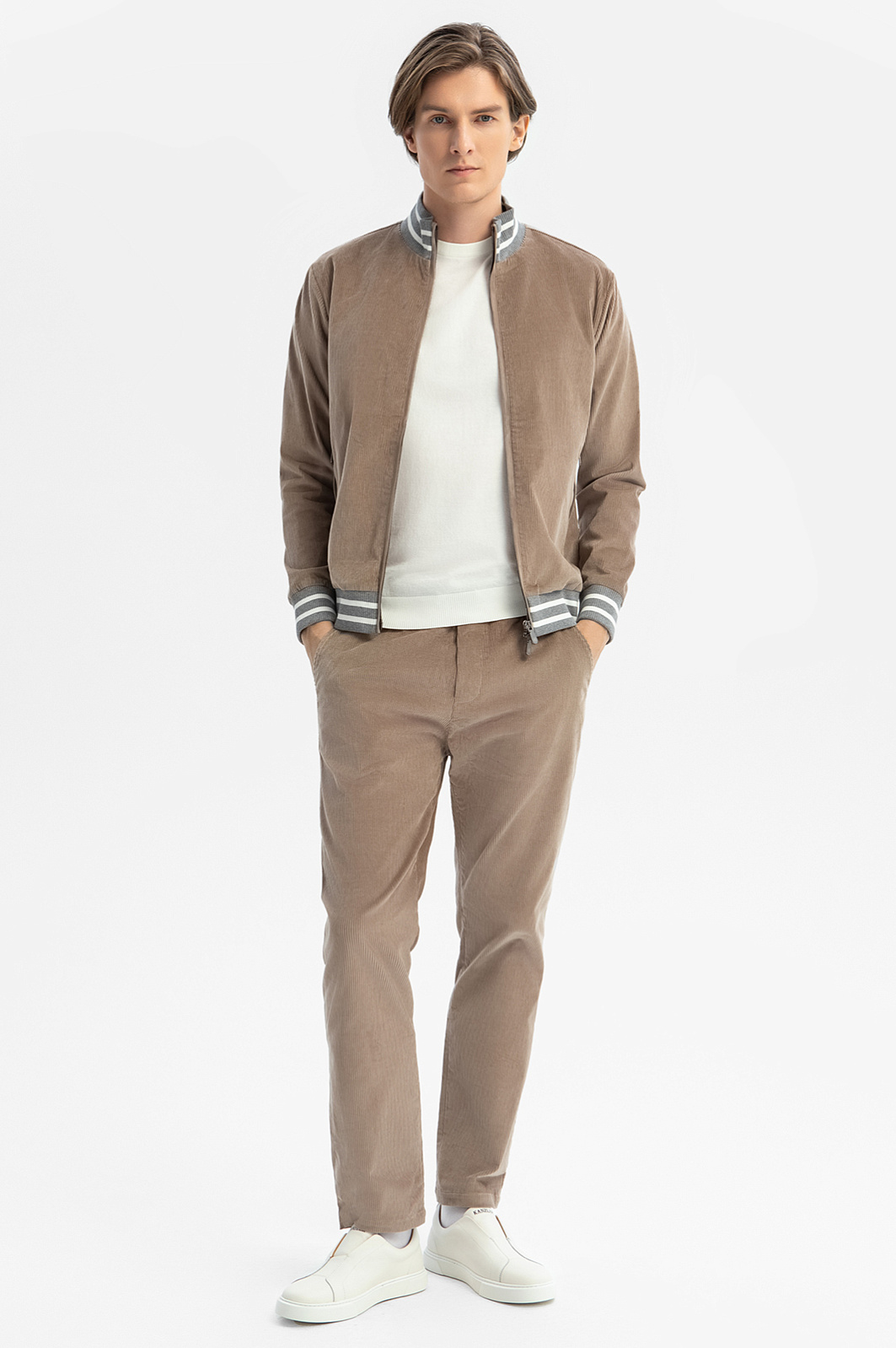 Роскошный песочно-бежевый вельветовый бомбер KANZLER из лимитированной коллекции адресован любителям непринужденного стиля, который сочетает комфорт и современную эстетику. Светло-серые трикотажные резинки с белыми полосками придают модели легкость и спортивных шик. Для прогулки по городу куртку можно дополнить джинсами, для уик-энда — вельветовыми брюками KANZLER того же оттенка. Мягкий вельвет произведен лидером в создании премиальных тканей из хлопка — мануфактурой Duca Visconte di Modrone (Италия). Материал состоит из гипоаллергенных воздухопроницаемых натуральных волокон, которые поддерживают свежесть тела, сохраняют тепло в холодную погоду и охлаждают в жару. Параметры модели: рост 191, 97-77-99 Размер на модели: 50