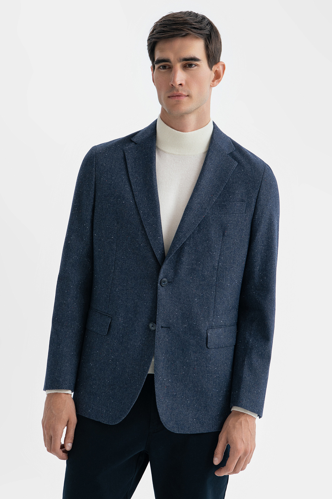 Раскрываем офисный стиль по-новому с пиджаком в стиле кежуал, добавляя нотку современности в гардероб. Если ваш офисный дресс-код позволяет больше свободы в выборе одежды, обратите внимание на эту модель в благородном синем оттенке. Плотный смесовый материал (42% хлопок, 36% шерсть, 22% полиэстер) сохраняет тепло, обеспечивает долговечность, комфорт и простоту ухода. Цветные вкрапления и накладные карманы придают образу непринужденность. Дополните образ белой водолазкой или джемпером и брюками. Параметры модели: рост 192, 101-76-97 Размер на модели: 50