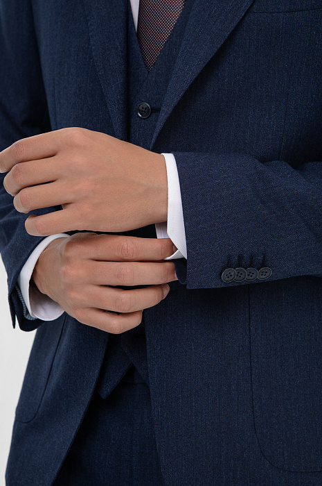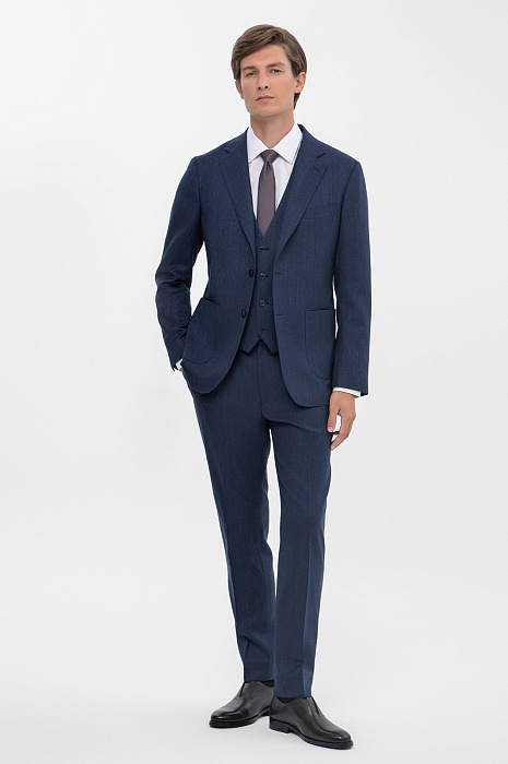 Приталенный пиджак KANZLER из натуральной мягкой шерсти — идеальный выбор для создания элегантного мужского образа. Он входит в комплект тройку с брюками и жилетом и завершает ансамбль для деловых встреч или торжественных мероприятий. Модель изготовлена из премиальной натуральной шерсти Супер 120S, которая отличается превосходным качеством ткани, сочетает в себе мягкость, лёгкость и высокую износостойкость. Она мягко облегает фигуру, не стесняя движений, при этом всегда возвращаясь к своему первоначальному виду. Подкладка из прочного смесового материала добавляет изделию комфорта в носке. Вискоза отвечает за мягкость и приятные тактильные ощущения, а синтетические волокна делают её прочной и устойчивой к износу. Насыщенный тёмно-синий оттенок, классический и благородный, и оригинальная неоднородная фактура ткани, которая визуально оживляет поверхность, оптимально подходят для делового гардероба, легко сочетаясь с рубашками и аксессуарами. Параметры модели: рост 191, 97-77-99 Размер на модели: 50