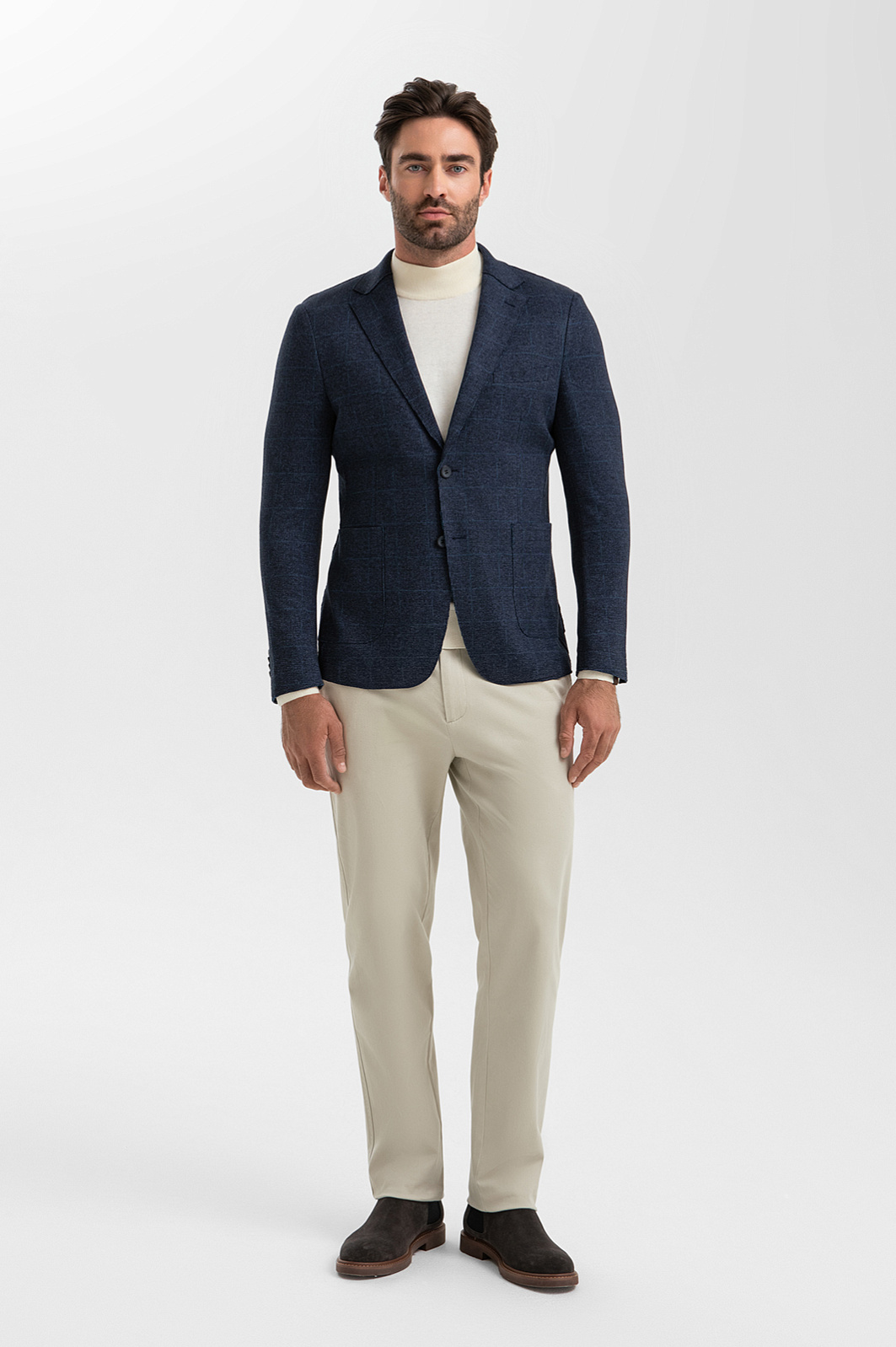 Роскошный пиджак KANZLER в клетку из хлопковой ткани глубокого синего цвета — идеальное сочетание итальянского стиля и современного комфорта. Такая модель одинаково уместна в офисе, на встречах, в поездках и путешествиях. Слегка приталенный силуэт подчёркивает контуры фигуры, расставляя акценты на мужественных плечах и линии талии. Мягкая облегчённая структура без подкладки делает модель универсальной и удобной в носке. Умеренно широкие лацканы с классической петлицей добавляют элегантности, а аккуратные накладные карманы — непринуждённости. Широкий подборт аккуратно оформляет внутреннюю часть. Внутренний карман с яркой контрастной рамкой — эффектная деталь, которая подчеркивает индивидуальность владельца. Состав из натурального хлопка с полиэстером обеспечивает приятную текстуру, воздухопроницаемость и устойчивость к износу. Параметры модели: рост 192, 101-76-97 Размер на модели: 50