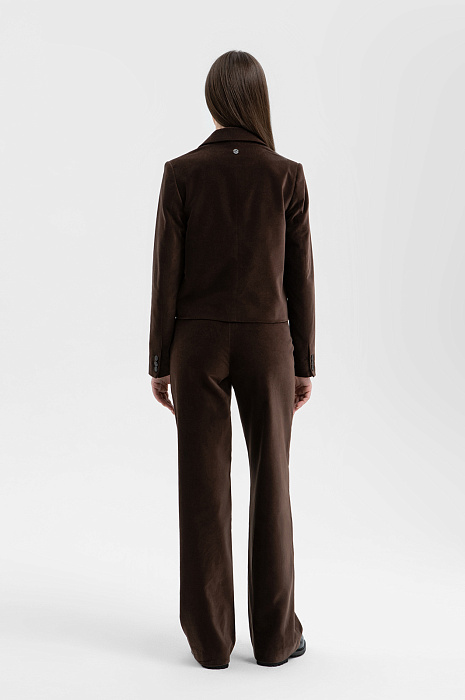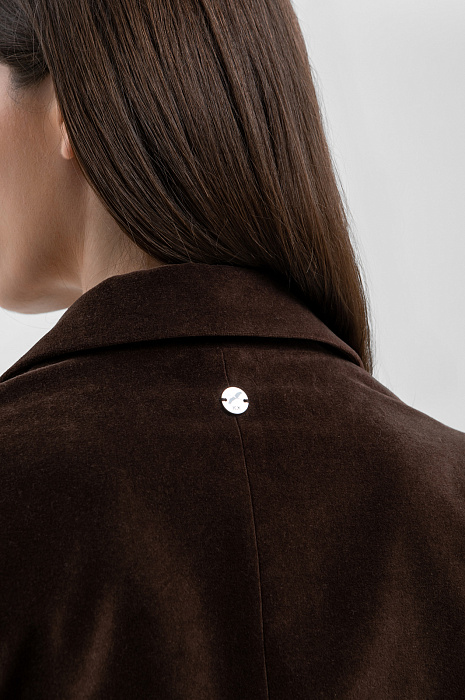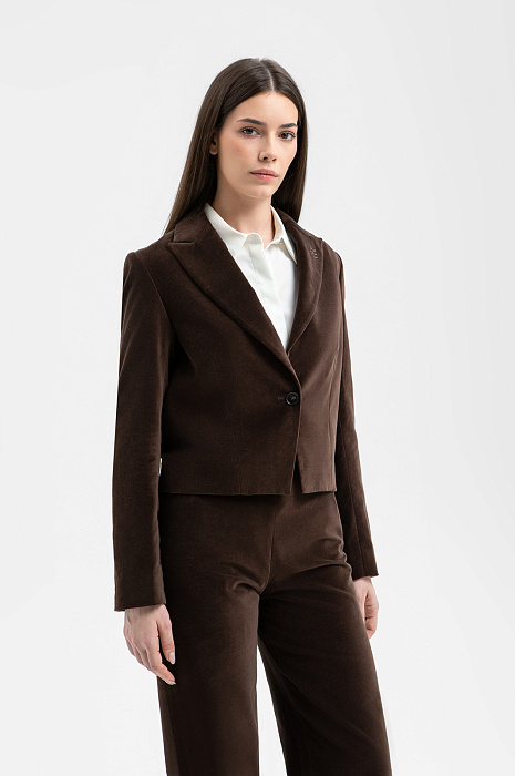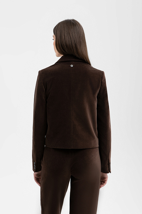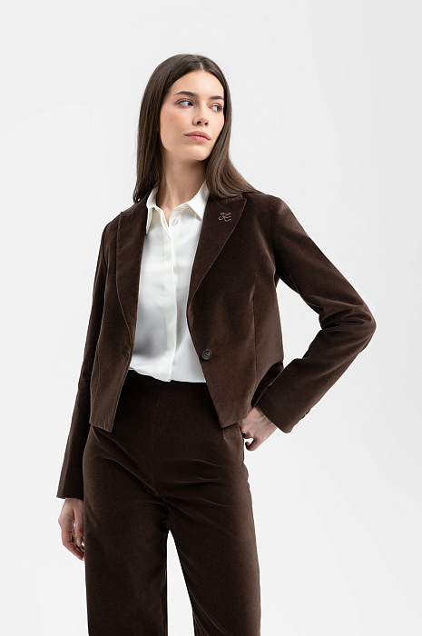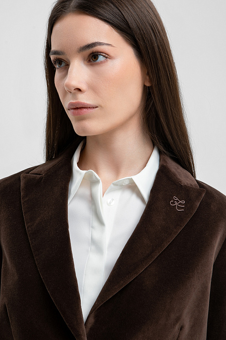 Пиджак KANZLER глубокого насыщенного шоколадного оттенка из бархатистой ткани сделает любой образ роскошным, элегантным и немного таинственным. Укороченная модель прилегающего кроя подчёркивает женственность фигуры. Она подойдёт для деловых встреч, коктейлей и светских мероприятий, а также украсит образы в стиле умный кежуал с брюками или джинсами. Лацканы с мягкими плавными очертаниями украшены фирменной вышивкой, спинка — небольшим круглым шильдиком из белого металла. Ткань из 100% гипоаллергенного хлопка дарит настоящий комфорт. Его приятная бархатистая фактура подчёркивает премиальный характер вещи.