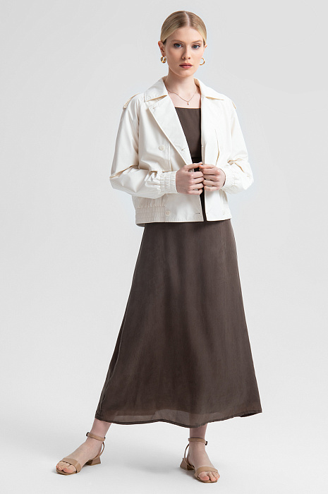 Элегантное платье-миди выполнено из 100% купро — материала, известного своей мягкостью и шелковистой фактурой. Лаконичный дизайн формирует утонченный и актуальный силуэт, а длина миди делает платье подходящим как для повседневных прогулок, так и для особых случаев. Открытые плечи и изящные тонкие бретели создают легкий и воздушный образ. Купро хорошо пропускает воздух и впитывает влагу, обеспечивая комфорт даже в жаркий день. Этот экологичный материал похож на шелк, что гарантирует приятные тактильные ощущения и эффектный внешний вид. Подкладка из вискозы дарит комфорт в течение всего дня. Нейтральный коричневый оттенок будет гармонично сочетаться с аксессуарами золотых, бежевых или пастельных тонов. Идеально подходит для повседневного стиля или вечернего выхода. Параметры модели: рост 175, 88-65-92 Размер на модели: S