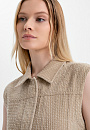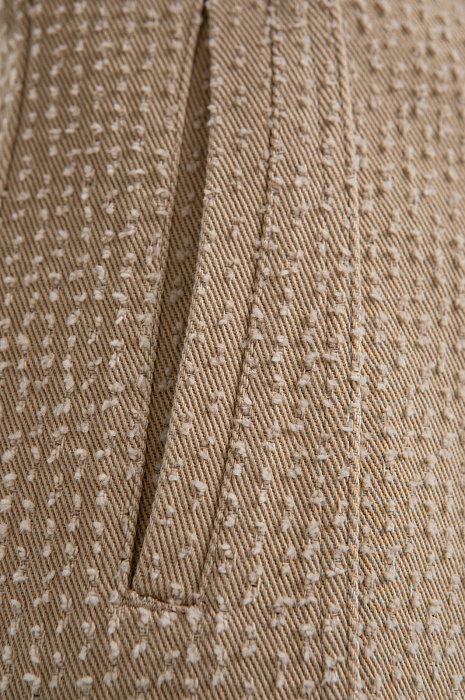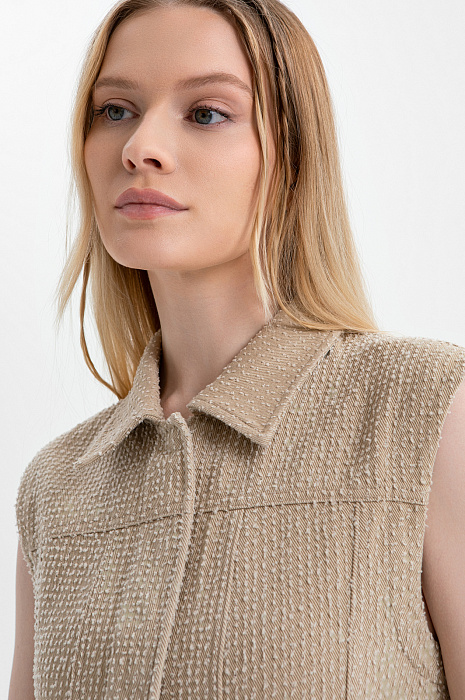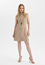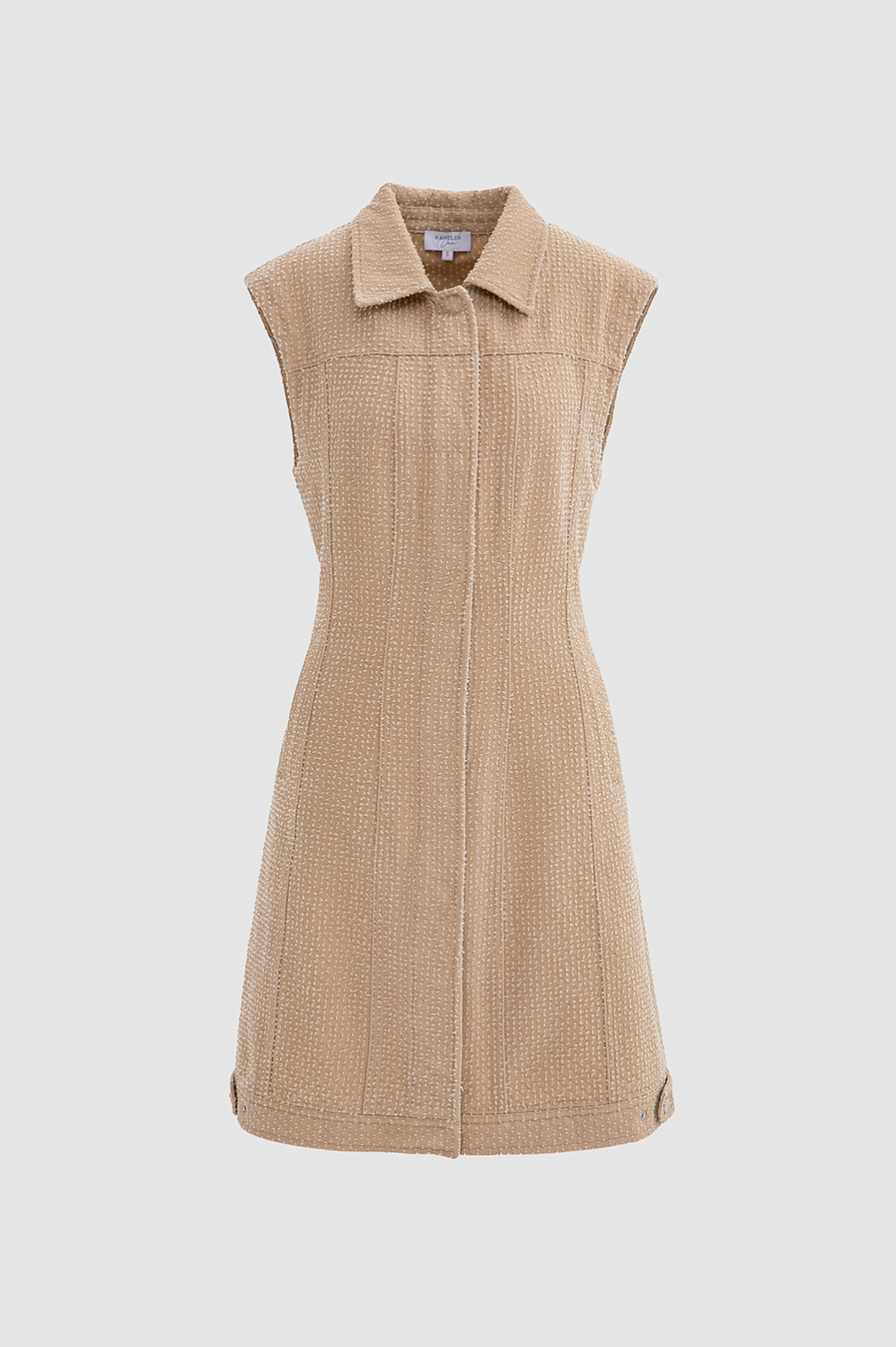 Платье-мини KANZLER без рукавов из бежевой хлопковой ткани сочетает современный минимализм, спорт-шик и городскую эстетику. Лаконичный прилегающий крой подчёркивает линию талии и контуры тела. Передняя часть и спинка выполнены из вертикальных клиньев, которые задают архитектурную строгость и визуально вытягивают фигуру. Текстурный узор добавляет модели шарм и приятную тактильность. А декоративные застёжки c кнопками на подоле отсылают к классической джинсовой одежде. Ткань выполнена из чистого хлопка. Натуральные гипоаллергенные волокна поддерживают циркуляцию воздуха и спасают от перегрева в жаркие дни. Практичный саржевый материал хорошо держит форму и не требует особого ухода.