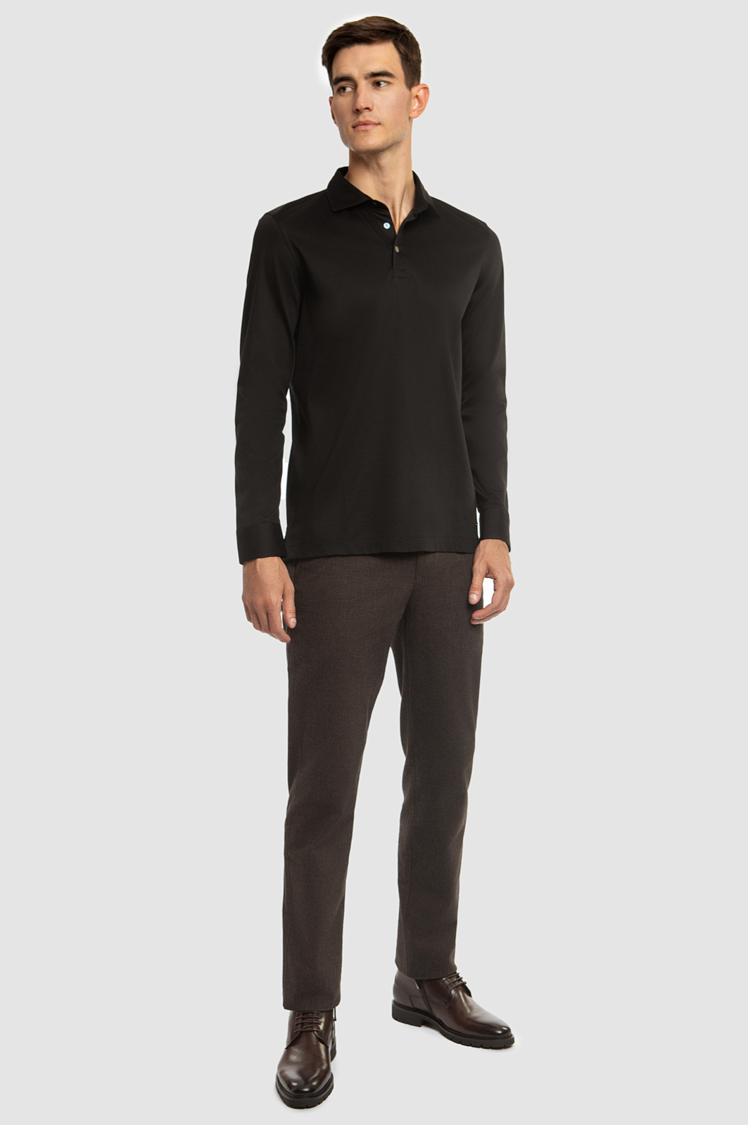 Практичное поло KANZLER на трех пуговицах с длинным рукавом выполнили из мягкого хлопкового трикотажа в универсальном черном цвете. Однотонное лаконичное поло прямого кроя без контрастных деталей легко впишется в повседневный мужской гардероб и станет основой для ваших образов как в стиле кежуал, так и в классических интерпретациях. Гладкий тонкий материал хорошо сохраняет тепло и при этом почти не ощущается на теле, обеспечивая комфорт на весь день. Наши стилисты рекомендуют сочетать его с брюками и пиджаком, завершив образ коричневыми высокими ботинками. Параметры модели: рост 192, 101-76-97 Размер на модели: M