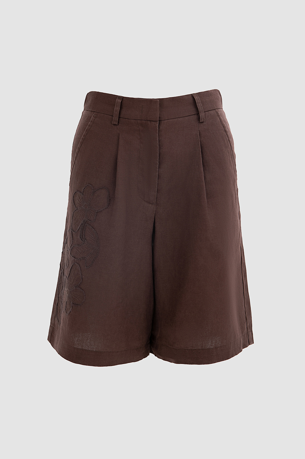 Коричневые шорты KANZLER изо льна, украшенные цветочной вышивкой, — универсальная по дизайну и качеству материала вещь для тёплых дней. Она легко сочетается как с повседневной, так и с нарядной женственной одеждой. Элегантный свободный крой с мягкими складками спереди и карманами по бокам удобен для городских выходов и расслабленного отдыха. Лён — комфортный для тела материал, особенно в тёплые и жаркие дни. Его прочные гипоаллергенные волокна хорошо пропускают воздух, поддерживая ощущение прохлады. А естественная текстура придаёт вещи непринуждённый шарм в духе современных экотрендов.