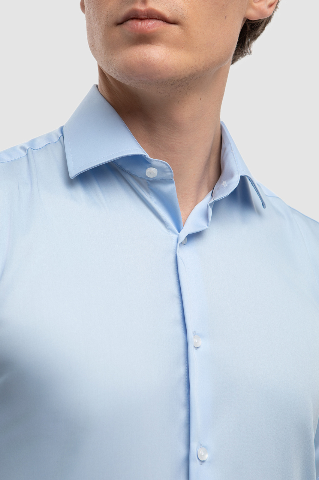 Голубая сорочка в нежно-голубом оттенке с лаконичной фурнитурой выглядит так, словно ее сшили из шелка. Для изготовления модели с классическим воротником использовали гладкий матовый материал из отборного премиального хлопка, который хорошо пропускает воздух. Длинноволокнистый хлопок придает изделию характерный деликатный блеск. Наши стилисты предлагают создать деловой образ с брюками в синем оттенке и лоферами. Параметры модели: рост 191, 97-77-99 Размер на модели: 40