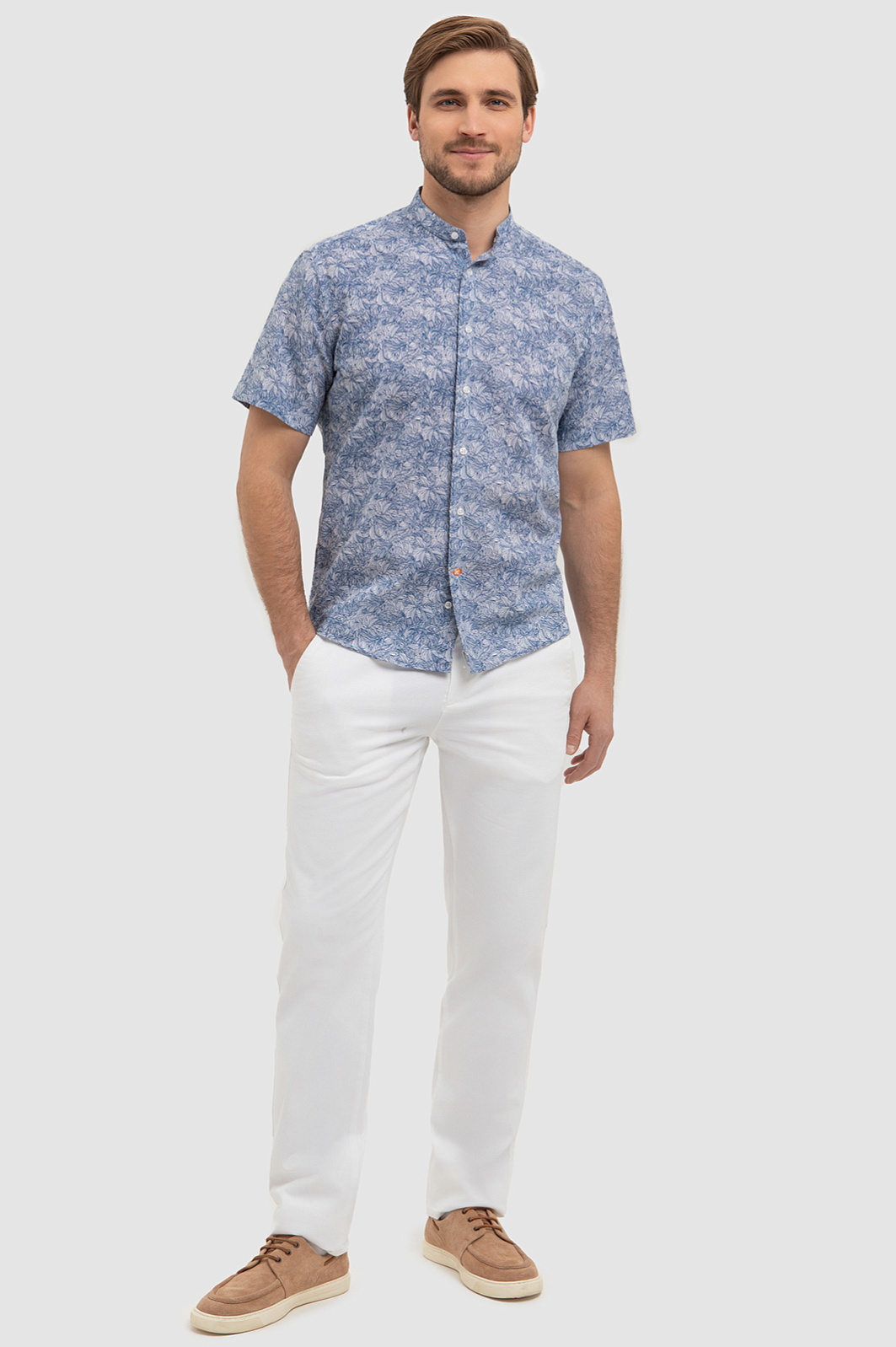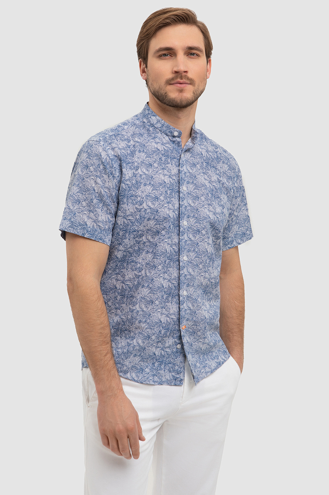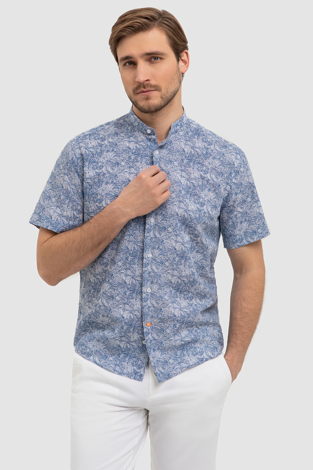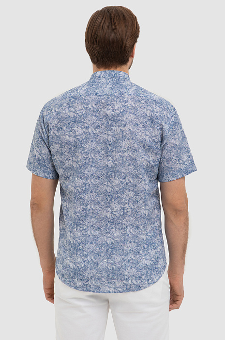 Красивая сорочка KANZLER изо льна и хлопка с коротким рукавом напоминает стиль персонажей сериала «Белый лотос». Модель подходит для расслабленного курортного отдыха, дегустации вин и морских прогулок. Свободный крой не сковывает движений. Натуральная ткань, украшенная синим растительным принтом, выглядит роскошно и благородно. Волокна льна создают ощущение прохлады, а мягкий гипоаллергенный хлопок поддерживает приятную для тела температуру и отводит влагу. Параметры модели: рост 187, 100-81-97 Размер на модели: 40