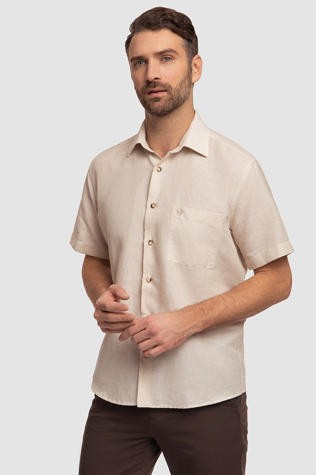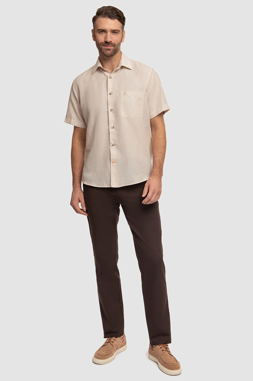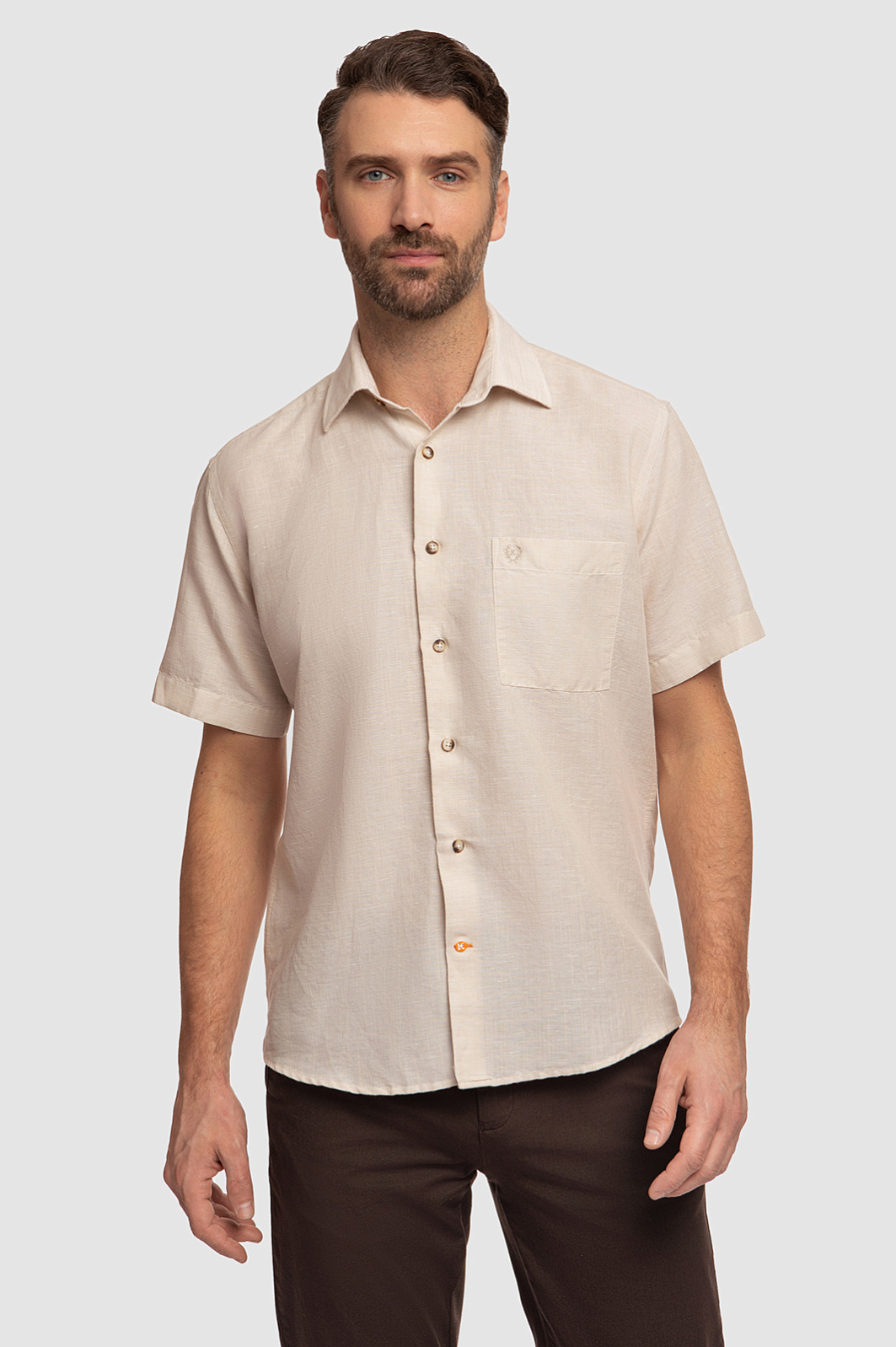 Сорочка KANZLER с коротким рукавом изо льна и хлопка приятного светло-бежевого оттенка создана для любителей мягких песочных оттенков, натуральных тканей и лаконичных классических моделей. Сорочка свободного кроя с накладным карманом, украшенным вышитым фирменной символом, подходит для обследования красивых мест, неспешных прогулок и спокойного безмятежного отдыха в приятной компании. Дорогая натуральная смесовая ткань Getzner (Австрия) мягко облегает тело. Волокна льна придают материалу прочность и создают ощущение прохлады. Гигроскопичные гипоаллергенные волокна хлопка поддерживают оптимальную температуру и защищают кожу от ультрафиолетового излучения. Параметры модели: рост 189, 102-80-99 Размер на модели: 40