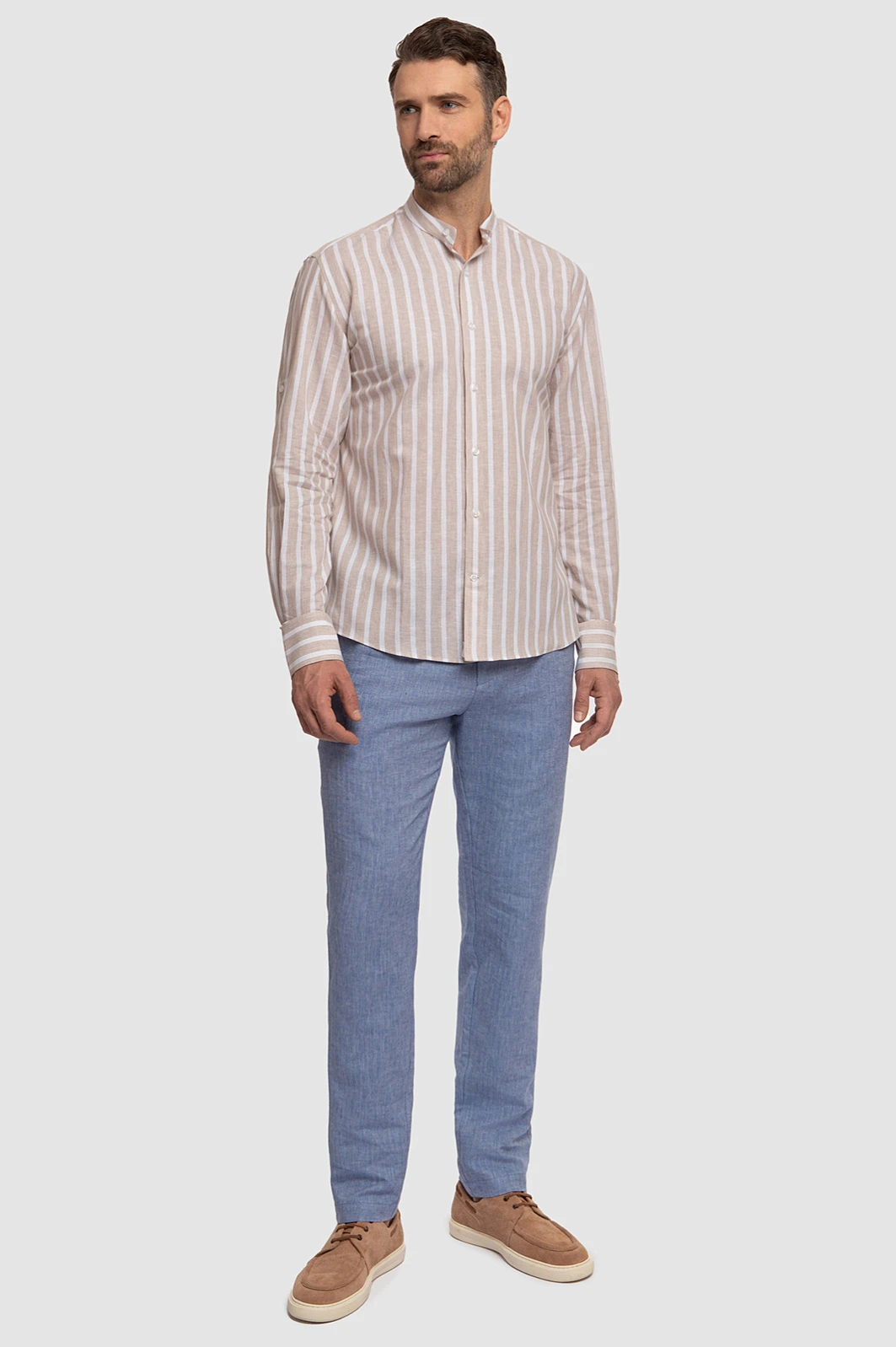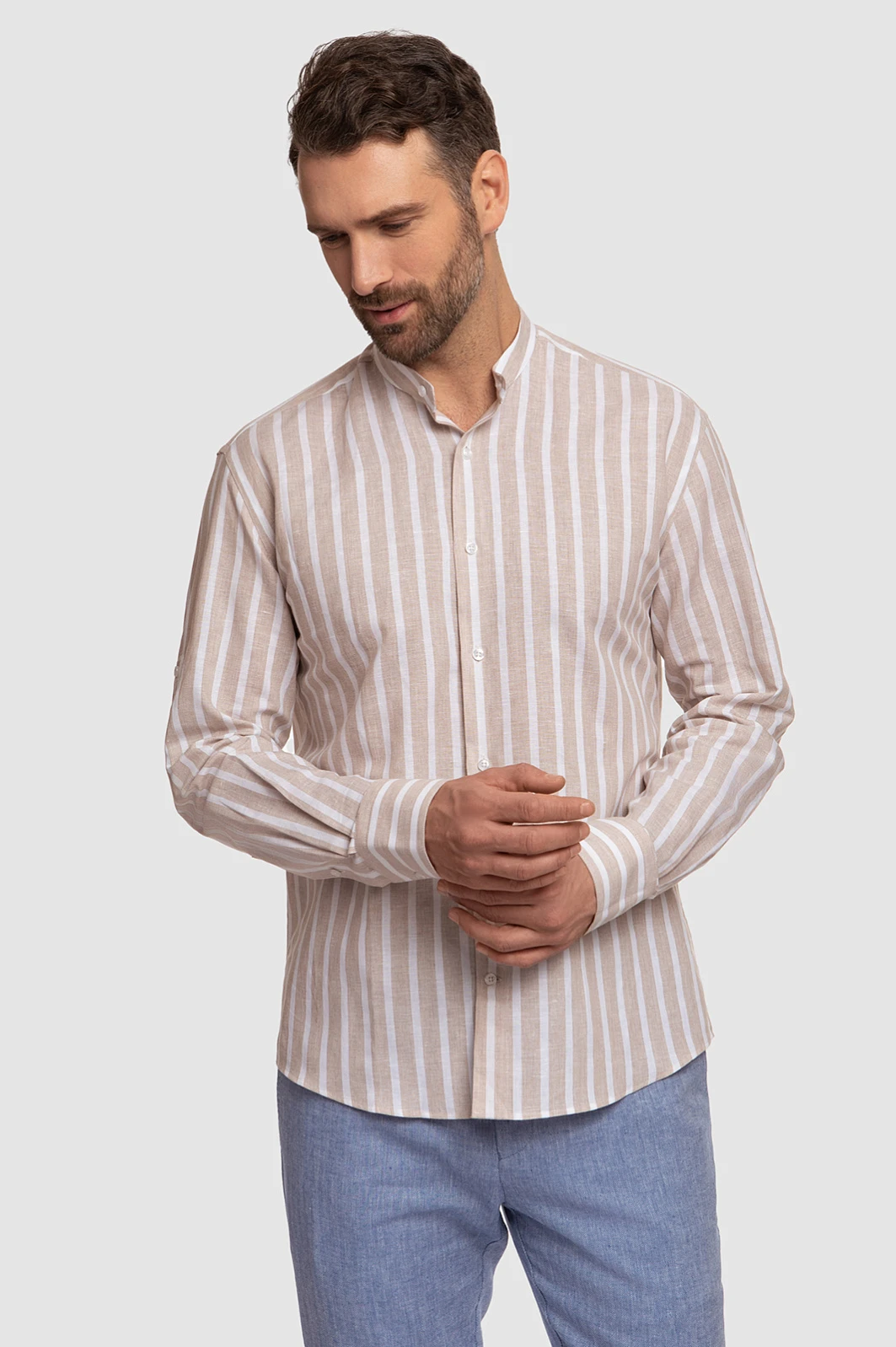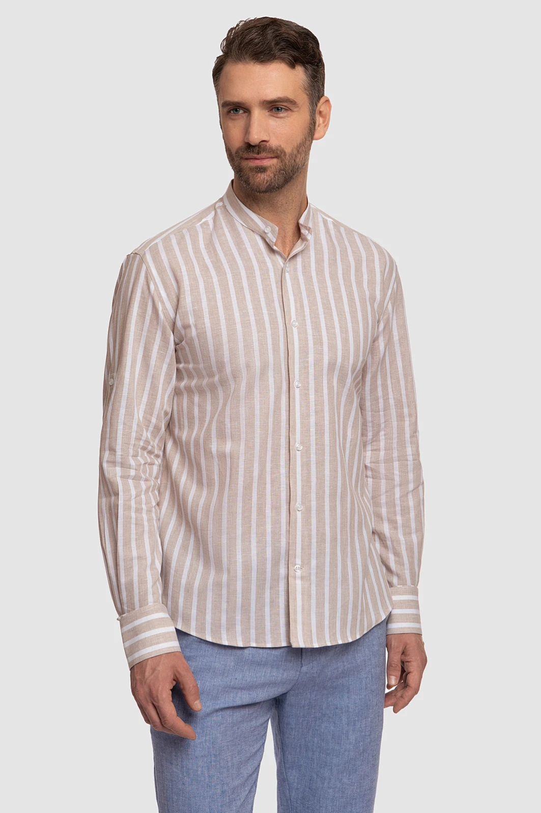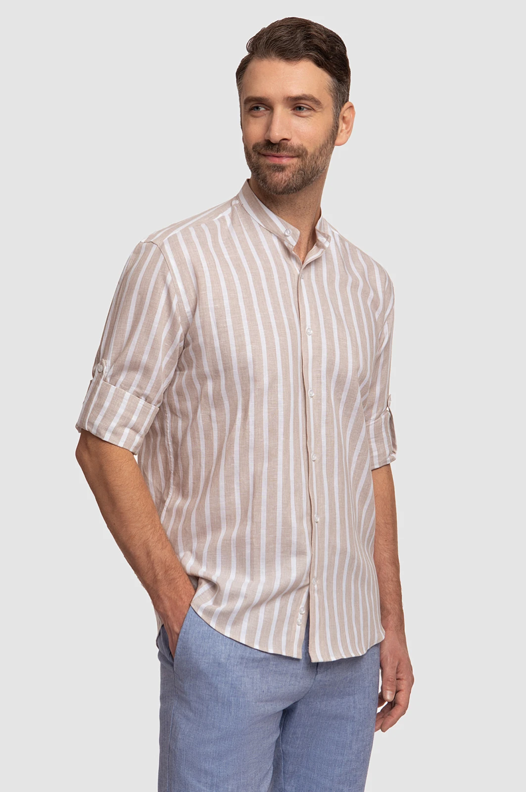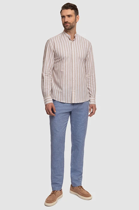 Рубашка KANZLER из хлопка и льна в полоску подойдет для повседневных образов, путешествий и отдыха. Модель выполнена из легкой ткани, которая сочетает в себе лучшие качества хлопка и льна: воздухопроницаемость, прочность, мягкость и приятные ощущения на коже. Воротник-стойка и принт в полоску добавляют нотку шика, а регулируемая длина рукава позволяет трансформировать рубашку по своему вкусу и в зависимости от погоды. Сочетайте модель с брюками, льняными шортами или светлыми джинсами. Параметры модели: рост 189, 102-80-99 Размер на модели: 40