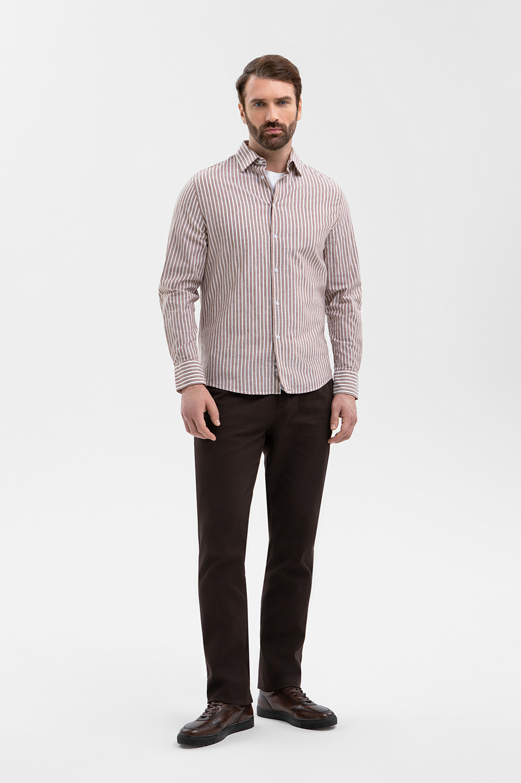 Сорочка KANZLER коричневого оттенка из хлопка и льна — пример современной мужской классики, в котором комфорт и эстетика существуют на равных. Коричневый оттенок выглядит тепло и стильно. Вертикальная белая полоса визуально вытягивает силуэт и добавляет образу графичности. Прямой крой задаёт спокойный уверенный силуэт, не перегружая образ. Роскошная ткань сделана из гипоаллергенных материалов: 70% хлопка и 30% льна. Хлопок отвечает за комфорт и свежесть, а лён придаёт материалу лёгкую фактурность. Натуральная ткань хорошо держит форму и со временем лучше адаптируется к фигуре, приобретая расслабленный и естественный вид.