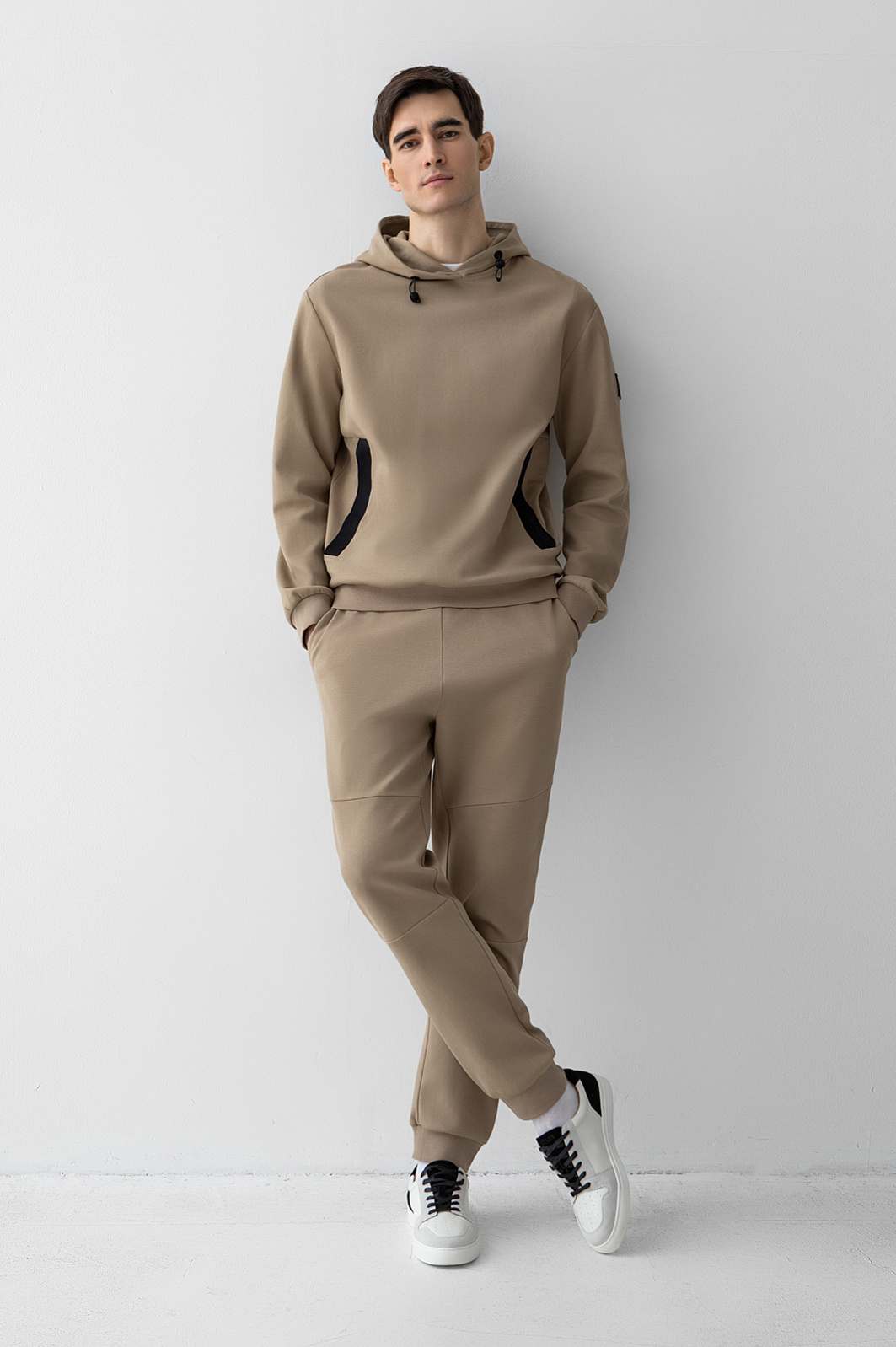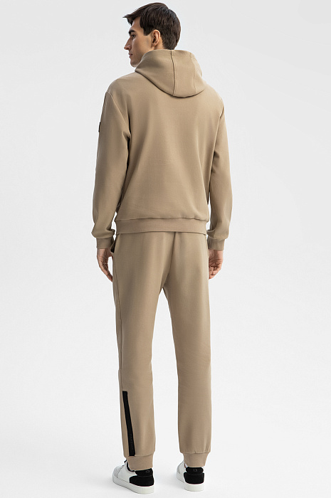 Спортивный костюм KANZLER из бежевой хлопковой ткани в диагональный рубчик с контрастными деталями — удобная одежда для свободного времени, когда можно сполна насладиться любимыми занятиями и активным отдыхом. Плотные широкие трикотажные резинки отлично придерживают края толстовки и низ брюк. При ветреной погоде шнурок с фиксатором позволяет плотнее затягивать капюшон. Фиксатор на брюках служит для регулирования объема талии. Пара сшита из натурального дышащего гипоаллергенного хлопка (89%) с добавлением полиэстера. Смесовой материал не боится капризов погоды, испытания временем и сохраняет естественное тепло тела.