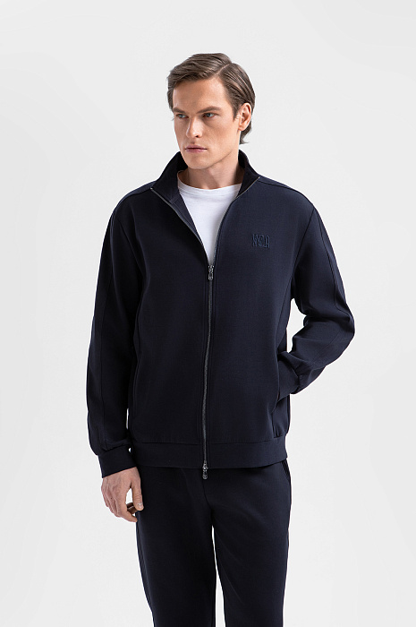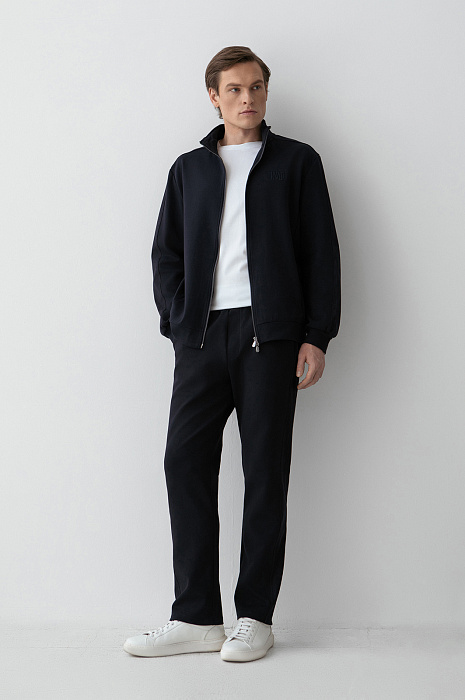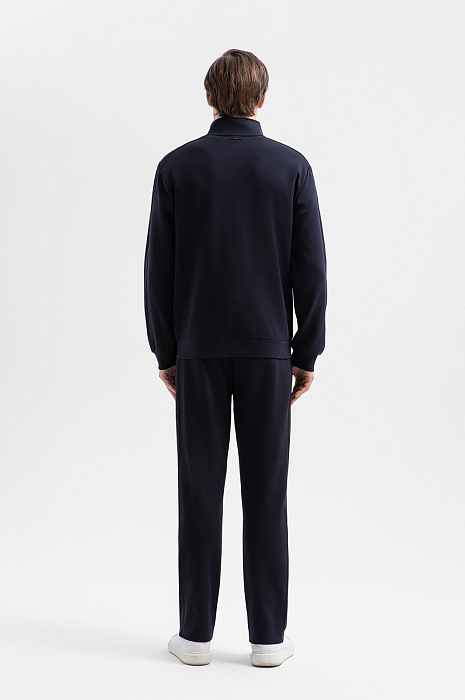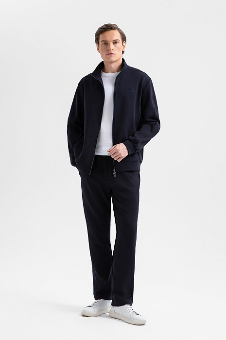 Тёмно-синий костюм KANZLER принадлежит и миру спорта, и уличному стилю. Миссия выполнима: в нём можно тренироваться, гулять и предаваться ничегонеделанию дома. Комплект состоит из толстовки на молнии и свободных брюк на кулиске. Мягкий трикотаж сочетается с вставками из полиэстера, которые подчёркивают современный характер костюма и делают его структуру выразительной. В составе трикотажа — натуральный гипоаллергенный хлопок, который поддерживает ощущение свежести и сохраняет естественное тепло тела. Добавление полиэстера и эластана придаёт материалу прочность и пластичность.