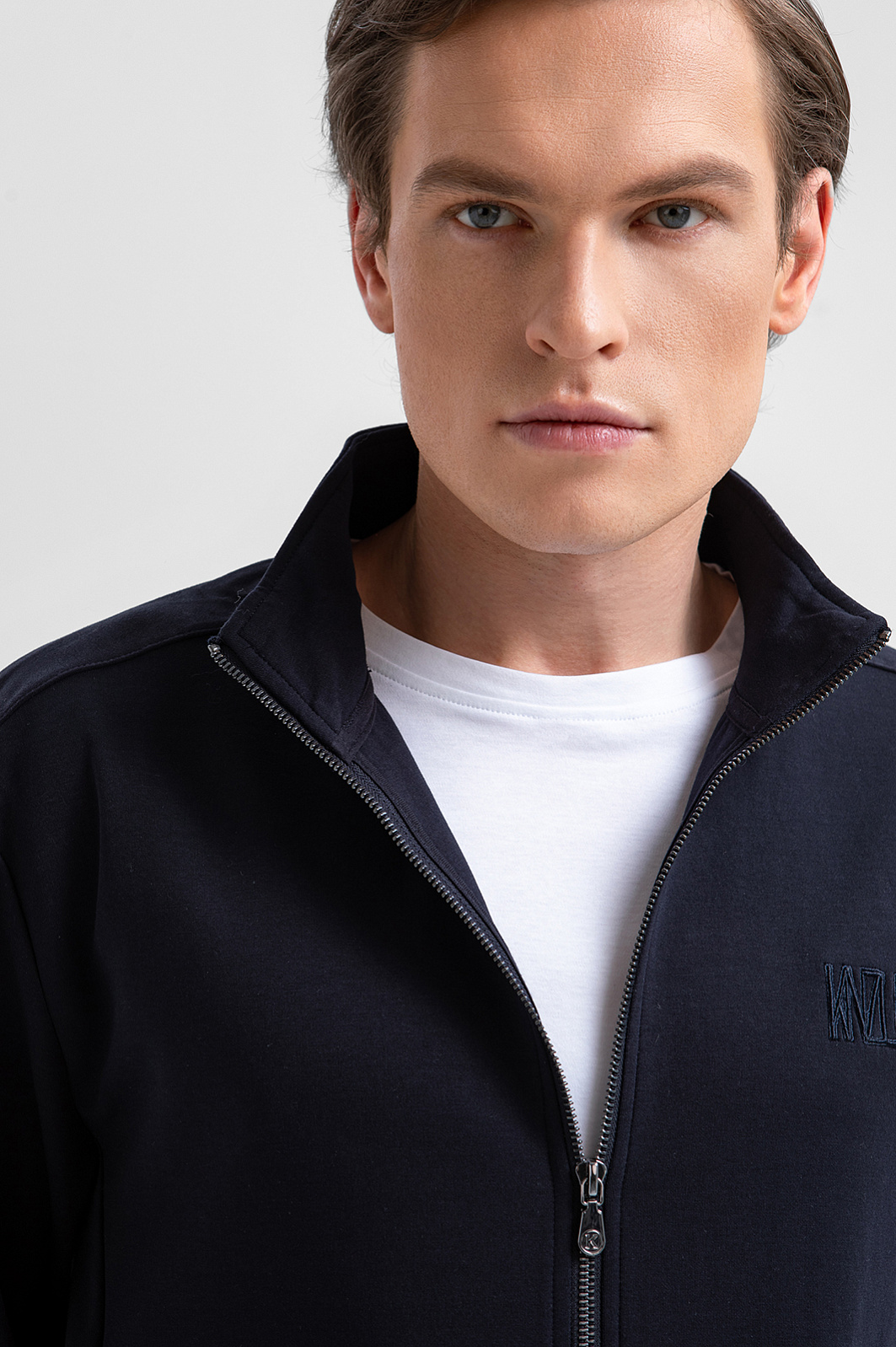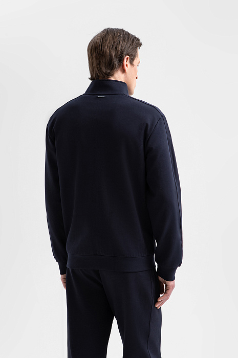 Тёмно-синий костюм KANZLER из хлопкового трикотажа с вставками из полиэстера — универсальный комплект для активного отдыха, прогулок и спокойных уикендов на природе. Костюм состоит из толстовки на молнии, украшенной вышитым логотипом и фирменным шильдиком, и свободных удлинённых шорт на кулиске. Комплект сшит из мягкого смесового хлопка. Его натуральные гипоаллергенные волокна поддерживают ощущение свежести и сохраняют естественное тепло тела. Добавление полиэстера и эластана придаёт материалу прочность и пластичность.