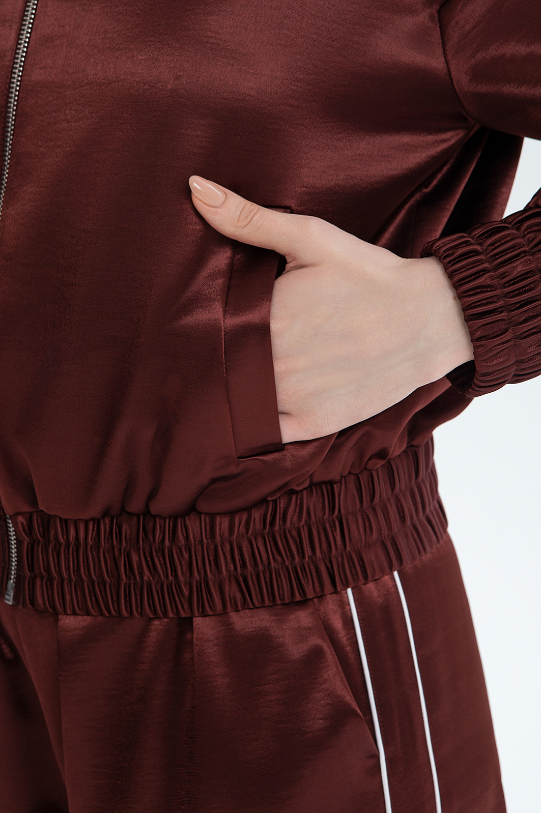 Атласная спортивная куртка KANZLER на молнии шоколадного оттенка с тонкими белыми полосками на рукавах — универсальная функциональная вещь, которая будет шикарно смотреться и с женственными юбками, и с джинсами, и со спортивными брюками. Спущенное плечо придает модели расслабленность. Аккуратную посадку обеспечивают резинки на рукавах и снизу. Струящийся атласный материал драпируется на теле красивыми мягкими складками. Легкие прочные волокна полиэстера не деформируются со временем и отличаются износоустойчивостью. Параметры модели: рост 175, 88-65-92 Размер на модели: S