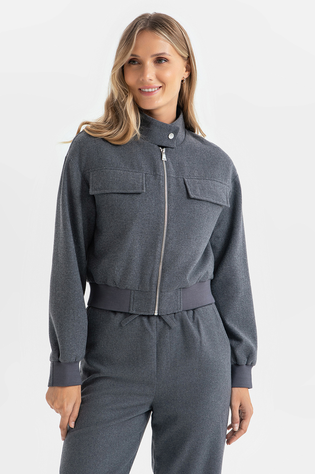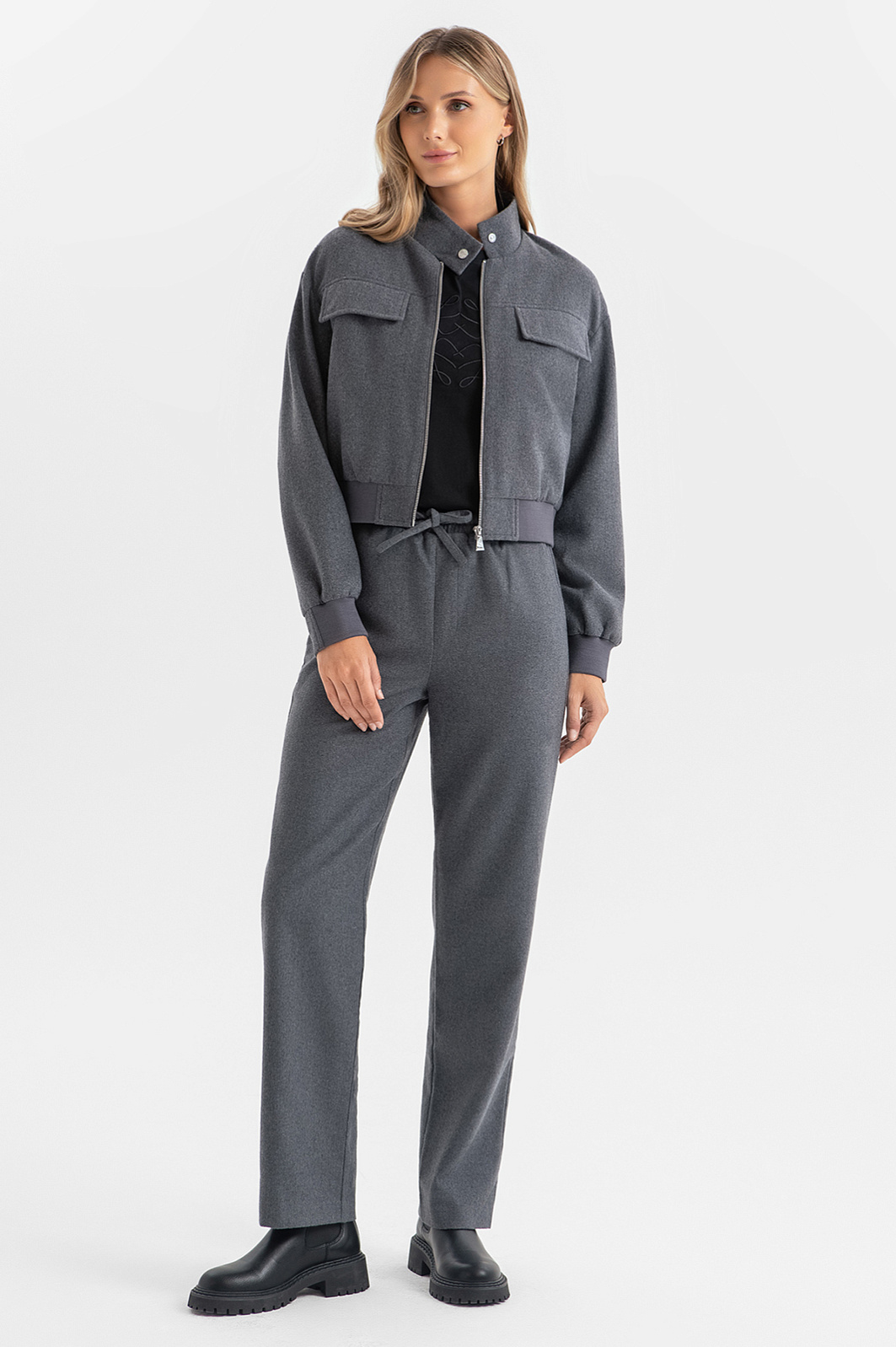 Классический бомбер в новом прочтении – укороченный жакет в глубоком антрацитовом оттенке – создан для динамичных девушек, которые любят находиться в движении. Для его создания дизайнеры выбрали смесовый материал премиального качества: волокна полиэстера отвечают за прочность и сохранение формы, а шерсть – за тепло, мягкость и комфорт. Изюминки образу добавляют детали – накладные карманы и кнопка на воротнике-стойке. Подкладка из гладкого материала гарантирует приятные ощущения на коже и комфорт в течение всего дня. Модель можно дополнить брюками из такого же материала. Параметры модели: рост 180, 87-61-91 Размер на модели: S